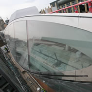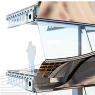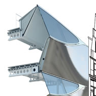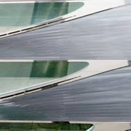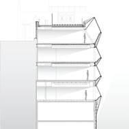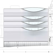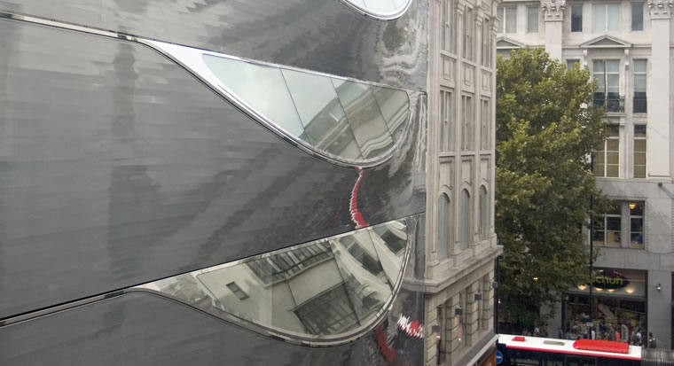 10 Hills Place, London - AL_A : Amanda Levete Architects Many narrow streets and alleyways off Oxford Street, London are currently misused and underdeveloped. These under regarded areas are ideal not only for improvement, but also for relatively unconventional design opportunities. Our proposal acknowledges this by providing an architectural intervention that subtly draws attention to the building through the intrigue of a sculptural façade. Inspired by the art work of Lucio Fontana large glazed areas orientated towards the sky are slashed into the façade, maximising the natural light available in this narrow street. This sculptural form is achieved using a system of aluminium profiles used in the production of high quality, ship hulls. The facade is fabricated using curved 140mm wide aluminium profiles that are connected together on-site, using a tongue-and-groove system ensuring water-tightness and construction efficiency. The metallic silver finish is a high performance durable paint typically used on super yachts. The use of self cleaning glass and an ingenious detail of hidden gutters within the eyelids ensures the facade remains low maintenance. The ground floor is fronted by a bespoke laminated glass in which is sandwiched a stainless steel mesh and semi opaque interlayer over a dichromatic film. This is lit from behind, using fibre optics to generate a coloured moiré pattern providing dynamic visual interest and a feeling of depth to what would otherwise be a blank wall.