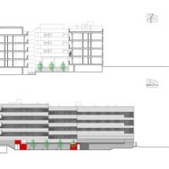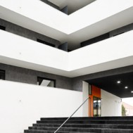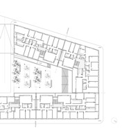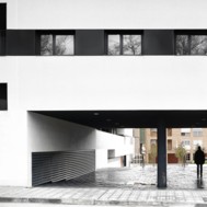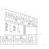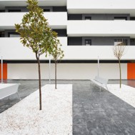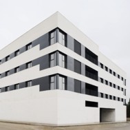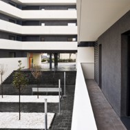 Edificio de 44 Viviendas Sociales en Tauste (Zaragoza) El origen del proyecto parte del análisis de la relación entre el espacio público y el espacio privado en una ordenación prevista por la normativa como manzana cerrada, definida por una edificación existente en el lado sur y el nuevo edificio, con planta en forma de U. La definición del espacio público interior, capaz de generar relaciones con el entorno edificado existente y de dotar de espacios atractivos de transición, mejora las condiciones de las viviendas, limitadas dado su carácter social, aportando un espacio exterior de acceso y relación. El edificio está situado en el límite Sur de Tauste, población situada a 50 km. al noroeste de Zaragoza. El proyecto evita el diálogo directo en términos formales con el entorno descontextualizado más próximo – el solar limita al norte con una zona verde, al sur con edificios de vivienda colectiva, al este con una zona industrial, y al oeste con la vía de acceso desde Zaragoza y el polideportivo municipal - siendo el espacio público interior el encargado de establecer relaciones y continuidades con los espacios adyacentes para la adecuada implantación de la actuación en su entorno. Con el objetivo de abordar el carácter urbano del interior de la manzana se plantean dos restricciones en la volumetría del edificio: la primera, encajar el aparcamiento en semisótano en la anchura de la doble crujía de las plantas alzadas de viviendas, renunciando a la ocupación máxima permitida para no reducir las dimensiones del espacio público; la segunda, liberar un porche de generosas dimensiones en el lado norte, bajo el edificio, que relaciona el espacio interior con la zona verde existente. Esta apertura, junto a las situadas en los lados oeste y sur del solar, el arbolado y el mobiliario urbano, contribuyen a entender el interior de la manzana como un espacio público. El proyecto también debía responder a la accidentada topografía del solar, con importantes desniveles entre el comienzo y el final del bloque, y a las limitaciones programáticas y económicas, habituales en este tipo de promociones. Los condicionantes del proyecto – la economía, presente en la elección de los materiales, y la adaptación a la topografía- se transforman en los argumentos formales del edificio mediante un lenguaje abstracto de bandas horizontales escalonadas, de color blanco y negro. Esta composición, que agrupa y ordena los diferentes huecos de las viviendas, aporta un cierto dinamismo horizontal a la rotundidad volumétrica de la manzana. El encuentro del edificio con el suelo se resuelve mediante un aplacado de piedra caliza en color blanco. En términos tipológicos, se trata de una promoción de vivienda pública de Suelo y Vivienda de Aragón, con un programa de 44 viviendas de protección oficial, de 3 y 4 dormitorios, aparcamientos y trasteros, en un bloque con planta en forma de U, de cuatro plantas alzadas que albergan las viviendas y una planta semisótano de aparcamiento. Los cuatro núcleos de comunicación dan acceso a tres viviendas por planta con doble orientación. Una de ellas es pasante, con doble circulación en torno al núcleo de servicios, a través del vestíbulo y de la cocina, comunicada directamente con el estar, ambos orientados hacia el espacio interior. En las dos viviendas restantes, el salón, en esquina cuenta con doble orientación, mientras que los dormitorios y la cocina se sitúan a cada lado respectivamente y el núcleo de servicios en el interior. La especial atención prestada desde el origen del proyecto al tratamiento del interior de la manzana como un espacio exterior cualificado tuvo un feliz corolario administrativo: al término de las obras, el espacio central fue objeto de segregación del resto de la parcela para pasar a ser de titularidad municipal, incorporándose a la red de calles, plazas y espacios públicos de Tauste. 44 Social Housing in Tauste (Zaragoza) The origin of the project starts from the analysis of the connection between public and private spaces. Planned in the regulation as a city block, the organization is defined for the pre-existing building on the south and the new building, with a “U” shape plan. The definition of the interior public space is able to generate connections with the pre-existing buildings in the surrounding and to provide with attractive transition spaces. It also improves housing conditions, limited due to their social character, giving them an external space of access, meeting and gathering. The building is located at the south urban edge of Tauste, which is situated 50 km away from Zaragoza. The project avoids the direct dialog in a formal way with the closest out of context surrounding – the site borders at the north with a green space, at the south with housing buildings, at the east with an industry zone and at the west with the access road from Zaragoza and the municipal sports centre. The interior public space establishes connections with the adjacent spaces to get an appropiated integration in the place. With the purpose of dealing with the urban character of the interior of the city block two restrictions are proposed: the first one is to fit the garage of the semibasement floor in the same width as the other floors, renouncing the allowed highest occupation, in order not to reduce the dimensions of the public space; the second one is to free a big porch at the north side, under the building, which relates the interior space with the pre-existence green space. This opening, together with the openings situated at the west and the south of the site, the trees and the urban furniture, helps understand the interior of the block as a public space. The project also had to respond to the topography of the site, with an important slope between the beginning and the end of the block, and to the programmatic and economic limitations, which are common in this kind of development. The determining