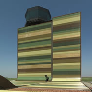 Aeropuerto Lleida-Alguaire, España, b720 Arquitectos La primera consideración al abordar la cuestión de cómo debe expresarse un pequeño aeropuerto en la escala del paisaje del altiplano de Lleida ha sido la de encontrar un equilibrio entre el intento de evitar un artefacto extraño aterrizado y la de no perder el carácter de hito, de referencia reconocible en la distancia. Sobre la superficie limpia y amplia de los campos de cultivo, fragmentada únicamente en su mismo plano por las texturas de los diferentes colores, no se busca una referencia a las habituales metáforas formales referidas a las alas, las aves o al mundo de la aerodinámica y la tecnología. El patchwork agrícola remite al lugar concreto y vincula el aeropuerto al territorio en el que se inserta. La traslación, cambiada de escala y regularizada, de los colores de las parcelas de cultivo de Alguaire, y por extensión de las tierras de Lleida, a la cubierta y la fachada no pretende un mimetismo de camuflaje sino una alusión directa al carácter del terreno, a su identidad. Unidad visual La envolvente principal se plantea como un manto continuo que cubre las caras más visibles del edificio para dar unidad formal al conjunto y consolidar su presencia dentro del contexto. De este modo, las variadas funciones y estructuras de ambos volúmenes quedan unificadas formal y visualmente mediante la cobertura de toda la fachada con una chapa metálica perforada de tonos verdes, ocres y amarillos, que sugieren la vinculación del edificio con el paisaje circundante. Asimismo, las chapas metálicas conviven con franjas vegetales de sedums y tiras de madera de pino tratado. La cubierta, a ambos lados de la torre, se curva y pasa a ser fachada de la torre. La marcada curva dibujada por la cubierta articula la singularidad de este proyecto en el cual ambos planos (horizontal y vertical) tienen diferentes funciones y estructura, pero comparten características formales y materiales que los hacen actuar como elemento unitario. Programa El programa de necesidades incluía un edificio Terminal, la torre de control y dos espacios destinados a talleres. Ninguno de ellos, debido a sus reducidas dimensiones, reunía las características suficientes como para representar el nuevo aeropuerto, por lo que la estrategia seguida busca la unión de los tres programas mediante un único gesto visual: un manto verde elevado, flotando sobre el terreno y con capacidad para plegarse suavemente y adecuarse a las funciones de cubierta y de fachada al mismo tiempo. Este manto agrícola permite que las futuras ampliaciones queden recogidas por el mismo gesto, de manera que el aeropuerto no se disgregue en numerosas edificaciones aisladas y exentas de relación entre sí, como se caracterizan habitualmente este tipo de grandes equipamientos. De esta manera, se potencia la flexibilidad del edificio gracias a la alfombra vegetal que lo cubre para un crecimiento futuro sin que el proyecto modifique sustancialmente su identidad y su huella en el lugar. Edificio Terminal El edificio Terminal, que filtra