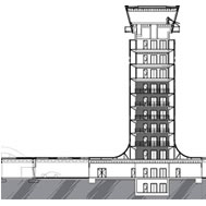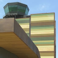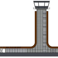 cielo desde el interior. Dos bloques técnicos opacos, entendidos como volúmenes compactos cubiertos por el orden superior de la cubierta, alojan las dependencias que necesariamente deben estar separadas de los espacios diáfanos, tales como servicios, equipajes, oficinas, salas de personal y de instalaciones. Torre de control La torre, de 42 metros de altura, se ha diseñado como una obra singular que va más allá de la propia estructura, englobando e integrando arquitectónicamente los proyectos de la terminal y los edificios anexos. En él, la arquitectura responde con igual efectividad a los requerimientos aeronáuticos, a los territoriales y a los paisajísticos. La torre se subdivide en planta baja y nueve alturas, acogiendo las funciones específicas de control aeronáutico. Programáticamente, en planta baja se disponen el acceso, el soporte técnico y de servicios propios de la torre de control; de planta tercera a la quinta, los espacios destinados a entidades de seguridad, mientras que de la sexta a la novena se ubican las estancias de descanso de controladores, instalaciones y administrativo. La planta técnica, en el primer nivel, aprovecha el espacio entre la planta baja y el resto de plantas, ventilando naturalmente a través de la fachada perforada. La fachada de la torre se forma por la continuación en vertical del manto de la cubierta de la Terminal, creando una doble piel traslúcida de madera, chapa metálica microperforada y lacada en diferentes colores, que homogeniza los huecos de cada sala interior, actuando a su vez como eficaz filtro solar. Por último, el fanal, pieza de geometría y materiales estrictamente invariables en una torre de control, permite la correcta visualización de las cabeceras de pista y plataforma, entendiéndose como una pieza técnica más, una antena parabólica más de las que necesariamente se deben colocar sobre la cubierta de la torre.
