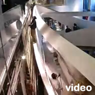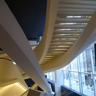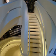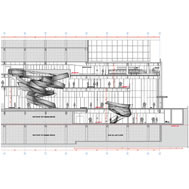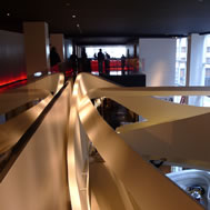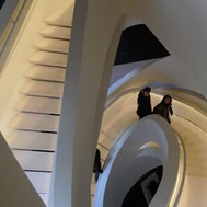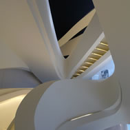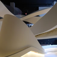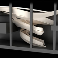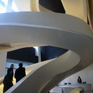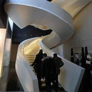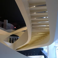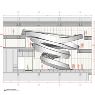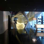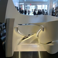 Armani/5th Avenue, New York After Hong Kong Chater House and Tokyo Ginza Tower, Fifth Avenue completes the trilogy of the Armani Stores designed by Doriana e Massimiliano Fuksas for the famous designer. Situated in the centre of New York, in one of the street more known, the project takes up the first three floors of two buildings localized between the 5th Avenue and the 56th Street. Besides the basement, the show room develops on four differents levels and it’s conceived of an only space, without clear distinctions, a singing space connected with the power generated by the whirlwind of the staircase. The nucleus of the project is the staircase that connects the floors. It’s a structure wrought with the radiator grill of steel, covered with plastic material that highlights the look of sculpture. It’s an element completely indipendent that can be assimilated with difficulty to a simple geometric figure, that originates a whirlwind with a great dymanism, and around of it there are the different levels that receives the Armani’s world. The movement of the ribbons that constitutes it, brings to the different floors, just skimming them and disenchanting the possibility to recognize the geometry and the static. The same movement arrives to lap the vertical surfaces tranferring to it a share of the dynamism. The general layout of every floor develops on the always different flexures, that enriches of shades the lightness of wall coloured mastic. No element is extraneus to the internal dynamism, not even the external façade; even if lined up to rigid orthogonal stitch of Manhattan, simulates the movement through images and shades projected on a set of LED thread. This screen, other than being the projection to the outside of the internal space, is also a particolar tribute to New York city, to the inescapable necessity to compare with his modernity and his dynamism. The fluidity of the internal space is rendered by the wall of continous thread, that are realized with wood panels lacquered monochrome. The different rays of bends that