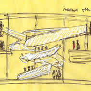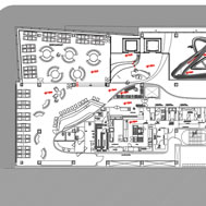 different functions of the general layout. There is a conflicting between the shine of the colour of the walls and of the furnishings, and the noir of marble pave and of the false ceiling. There is also a conflicting between the apparent simplicity of the internal space and the coffe and restaurant area that give advance notice of the elevator’s entrance. The bronze refolded and bended, that covers them, acquires and reflects the colours and the shades that gave notice of a mew atmosphere. Inside the restaurant, filtered by a amber veil, there is a splendid view of the 5th Avenue and in the end of Central Park. The colours and the materials utilized are the same of the rest of the show room, but the suggestions are nwe and different. The space become recreational, a line of light on the floor that leads to the entrance of the restaurant underlining the sensuality of the bends of the wall. A virtual curtain, they active the passage and as a theater...the show begins!