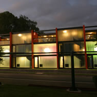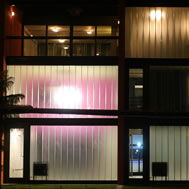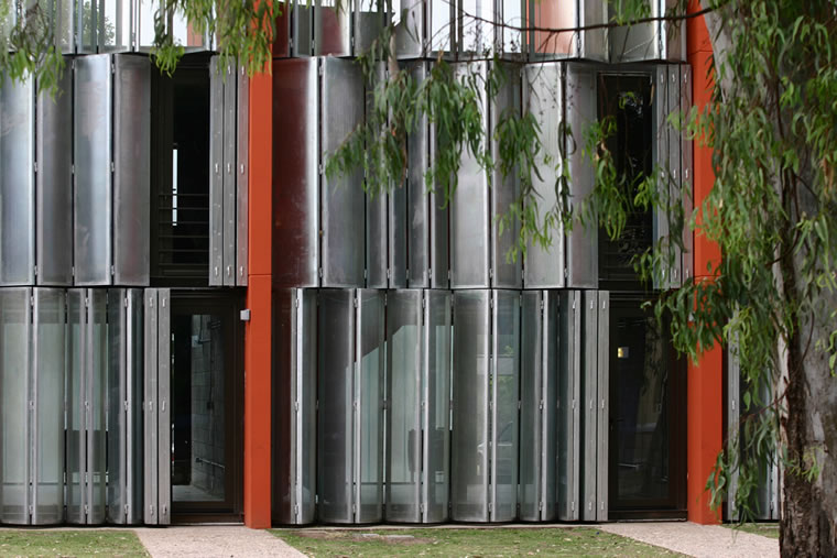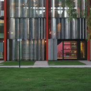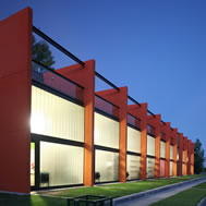 | Ateliers Ciudad de las Artes, Ciudad de Córdoba, Argentina Ganó el primer premio Bienal 2008 SCA CPAU de Arquitectura Argentina (categoría Conjunto de Viviendas) Esta obra es la culminación de las escuelas de la Ciudad de las Artes y presentaba el desafío de realizar un edificio con bajo presupuesto que tuviera una presencia importante y una personalidad muy fuerte. Son 10 ateliers para que artistas invitados, de nuestro país y extranjeros, puedan vivir, trabajar y enseñar en las distintas escuelas de la Ciudad de Las Artes por períodos cortos de tiempo (quincenas, bimestres, semestres, etc.). El primer desafío fue lograr un edificio que luciera individual, pero que a su vez tuviera una importante presencia unitaria dentro del conjunto de la Ciudad de las Artes. Esta formado por una seguidilla de muros de bloques hormigón, que llevan las instalaciones adosadas por una cuestión de costos y de fácil mantenimiento. Estos muros, sobresalen del plano de fachadas, generando en la fachada Sur un juego de sombras que protegen a la fachada de U-glass del poco sol directo que tienen durante el año. Otra idea fue la de generar una plaza exterior que pudiera ser utilizada como un lugar para la creación artística al aire libre, interactuando artista-alumno y naturaleza, a su vez cada atelier se abre completamente, mediante puertas plegables, permitiendo el ingreso de los alumnos al taller para participar del proceso de diseño de cada artista. Cada atelier expresa la individualidad del artista, fundamentalmente a través del color, ya que cada uno de ellos tiene un color único en su interior. Esta policromía comienza a manifestarse hacia el exterior al atardecer, cuando se encienden las luces interiores, y se comienza a filtrar a través del sistema de velos generado por los elementos transparentes, translucidos y perforados de sus fachadas. De esta manera el edificio que durante el día es monocromático, se transforma en un edificio multicolor. En cuanto a la localización del edificio, se buscó que todos los ateliers tuvieran orientación Norte/Sur (lo que asegura la mejor calidad lumínica posible para su uso) La fachada Sur es de U-glass permitiendo un muy especial ingreso de luz, y la fachada Norte también es vidriada y permite el ingreso de luz, pero tiene una protección de los rayos solares directos a través de paneles móviles de chapa perforada zincada, que permiten un juego que le brinda personalidad e individualidad a cada atelier, ya que cada artista modifica la fachada de acuerdo a sus necesidades. De esta manera la fachada, que