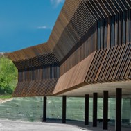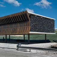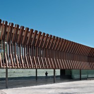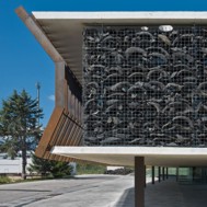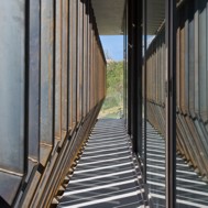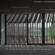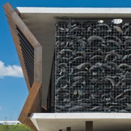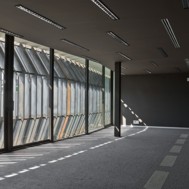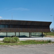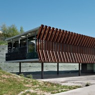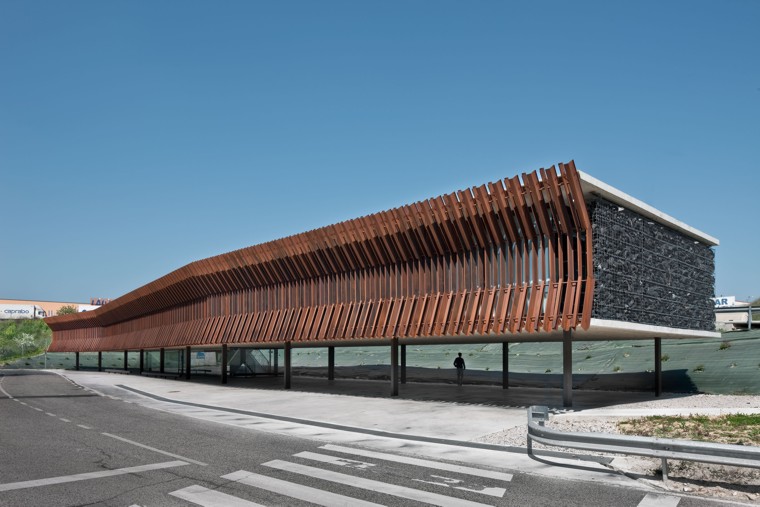 The building offers an image derived morphological genesis of his own: a tablet suspended, almost floating on the gentle slope green -slightly twisted-repeating the same gestures that the topography- and offers a gesture of successive concave ribs against the sun: In a flat landscape -almost one-dimensional-, as is the highway, immeasurably longitudinal, the building from where it controls and directs the company, contorts, and stands as lookout (also longitudinal), as a new "lookout" observer ... Two slabs of concrete lattice steel tape the cor-ten blocks south and north reused tire. The picture of the complex aims to establish close ties to the movement and infrastructure relating to transport, and perhaps away from the usual urban readings in similar programs