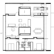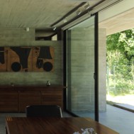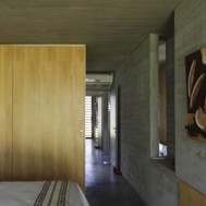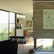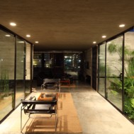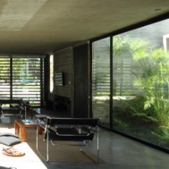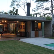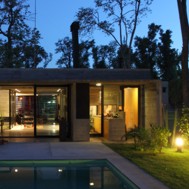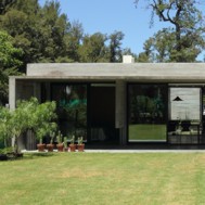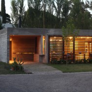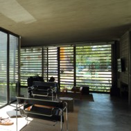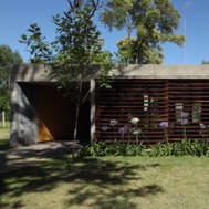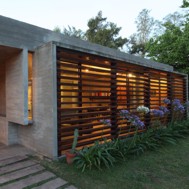 Casa BA, Villa Udaondo, Ituzaingó, provincia de Buenos Aires, Argentina El lugar Se trata de un terreno dentro de un pequeño condominio de 16 lotes ubicado en una zona del conurbano bonaerense, tradicionalmente de quintas, que con la traza de la Autopista del Oeste se ha ido, paulatinamente transformando, en lugar de vivienda permanente. Ubicado frente a los terrenos del Instituto Nacional de Tecnología Agropecuaria (INTA) esta localización tiene garantido a largo plazo seguir manteniendo una situación de privilegio respecto a su calidad de vida y su valor paisajístico. El encargo Una casa para ser usada como vivienda permanentemente de los arquitectos Besonías y Almeida que traía como condicionante fundamental, resolver las cuestiones relacionadas con la seguridad de la misma en ese lugar apartado y con pocos habitantes permanentes. Se sumaba a esta dificultad el hecho de que iban a ser de los primeros vecinos en habitar el pequeño condominio. Por supuesto la cuestión del cierre seguro tenía que ser resuelta sin que se resintiera la integración interior exterior tema irrenunciable en todas las obras del estudio. La otra cuestión a considerar era la flexibilidad de uso ya que si bien sólo la iban a habitar el matrimonio tenía que estar preparada para recibir muchos visitantes y alojar ocasionalmente a sus hijos. Por último era condición que la casa se desarrollara totalmente en planta baja. La propuesta El estudio siempre encara cada nuevo proyecto como una oportunidad de investigación en el campo teórico- práctico de la arquitectura. En esta ocasión ya que resolución de la seguridad de la vivienda resultaba tan relevante, pareció interesante ver hasta dónde este fuerte condicionante podía ser tomado como generador del proyecto. Hasta dónde la formalización se hacía dependiente de la solución del problema, y hasta dónde se podía tensar esa dependencia sin afectar el buen resultado estético, siempre operando dentro de costos standars para una vivienda. Revertir una supuesta condición negativa propia de este encargo y transformarla en motor de una búsqueda de soluciones que no desperdiciaran el potencial que ese problema encierra, fue una decisión que llevo a los proyectistas a proponer una casa que se extendiera hasta las medianeras para sólo tener dos frentes vulnerables. De esta manera las dos fachadas de casi 14 m de largo se transformaron en elementos esenciales de este proyecto. De esta primer decisión y de la necesidad de resolver el proyecto en planta baja surge casi naturalmente la propuesta de crear patios internos y así poder llegar con la luz natural y posibilitar ventilación cruzada a todos los espacios de uso. Se propuso entonces una casa resuelta en una planta dividida en 12 módulos espaciales (cuatro de frente y tres de fondo) de 3.30 de lado. Dos de ellos están vaciados y se proponen como pequeños patios interiores, con la vegetación como protagonista en uno, y el agua en el otro. Estos espacios sin techo se suman a los locales contiguos otorgándole una sensación de mayor amplitud y una atmósfera cambiante por los efectos que produce la luz entrando a través de ellos y la contemplación de vida que allí se desarrolla. Además ofrecen un recorte del cielo y del paisaje circundante desde los más variados ángulos de la planta. La fachada hacia el frente se proyectó como un plano compuesto por piezas de madera de quebracho apiladas que otorga intimidad a los ambientes que dan hacia dicho frente, además de resolver la hermeticidad de la casa. Hacia el fondo el sistema elegido para otorgarle seguridad de la vivienda debía resultar de rápido accionamiento y un costo razonable. La propuesta fue entonces una cortina metálica enrollable que cuando se abre queda totalmente oculta dentro de unas vigas invertidas del techo y que se acciona pulsando una tecla. La organización Funcional La casa está retirada de la calle interna del condominio por un jardín y un solado apto para estacionar un auto, realizado con durmientes de quebracho enterrados en la tierra. Como la vivienda llega de medianera a medianera fue necesario proponer, además de la entrada principal, otra de servicio que posibilitara una entrada directa al fondo del lote de manera de poder resolver las actividades de mantenimiento de mismo. Se accede a las dos puertas por un semicubierto. La puerta principal se abre a un único espacio, con el patio de agua y el patio verde como protagonistas principales. Allí se pueden desarrollar las actividades de reunión de una manera flexible, sólo determinadas por su equipamiento. Hacia un lado de este espacio, y protegidos de las vistas detrás de un tabique colgante, se encuentran los dormitorios y los baños y hacia el opuesto, la entrada de servicio, la cocina (que se insinúa apenas a través del patio verde) y el lavadero. Hacia el fondo las diferentes actividades de la casa se extienden en un semicubierto que va de medianera a medianera, haciendo muy indefinidos los límites entre interior y exterior. La casa se vincula con la piscina a través de un solárium el resto del lote está libre para que empiece a ocuparlo la vegetación proyectada. La solución estructural La planta de la casa, de 13.70m x 13.00m, está cubierta por una serie de losas de hormigón armado, con vigas invertidas en todo su perímetro que esconden el contrapiso de pendiente y la membrana hidrófuga. Estas losas descansan en los dos laterales medianeros y en una serie de tabiques internos dispuestos según la grilla modular y “con espesor” como para funcionar también como lugares de guardado La construcción Como ya se señaló la solución constructiva del plano de cierre de fachada es un elemento que requirió de un estudio detallado ya que de esto dependía la presentación de esta vivienda. Debía ser un elemento que permitiera la entrada de luz pero que a la vez asegurara la hermeticidad de la casa. Se decidió, por razones estéticas y