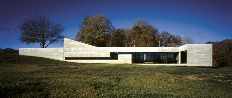 | Casa Bianna, Girona - España / Hidalgo Hartmann Memoria descrptiva Situada en un valle de carácter agrícola rodeado de montañas, la casa se somete al protagonismo de su entorno natural con respeto, integrándose en sus tierras y abriéndose a las vistas con aperturas precisas que enmarcan el paisaje. Con sus perfiles alargados, y de poca altura, esta vivienda funciona como nexo de unión entre los diferentes rasgos de su entorno que quedan atrapados en su interior mediante los porches y patios bajo la cubierta continua que los engloba. La casa se compone de dos volúmenes de hormigón que se insertan en el territorio fundiéndose en él. Ambos volúmenes de diferente tamaño se traban al terreno mediante la prolongación de los muros de contención que los definen, modificando la topografía del terreno para quedar integrada en ella. Los dos volúmenes se unen entre sí, mediante la rampa de acceso que se convierte en un espacio exterior autónomo, una parte de la naturaleza que ha sido aislada y apropiada por el hombre. El volumen principal aloja el programa de vivienda y el otro el garaje y espacios técnicos. La vivienda contiene la sala de estar tratada como un porche abierto al paisaje, la cocina con su aseo y lavadero, dos habitaciones separadas por un patio, dos baños, la habitación principal y en la planta superior como final del recorrido a cota de acceso a la casa desde el camino, nos asomamos desde el estudio al paisaje que hemos dejado atrás al acceder a la casa.