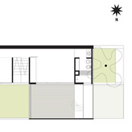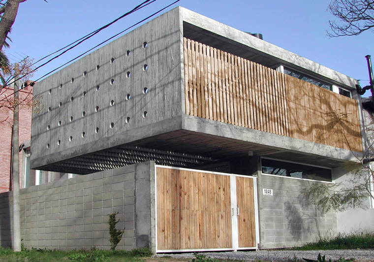 Casa Buceo, Montevideo - Uruguay Memoria descriptiva La vivienda se implanta en un terreno, de 7.50 x 17.50 metros, con la fachada más larga hacia el norte. El proyecto se estructura en base a dos bandas bien diferenciadas, una patio, la otra vivienda, una blanda y ausente, la otra dura y presente. Esto genera una vivienda que se abre al patio y al norte, ya que el patio se coloca por delante, dejando que la casa absorba todo el sol y generando privacidad a partir de un muro elevado que define el patio al frente. Este patio se plantea como extensión de la vivienda y también como extensión visual, es decir los límites no son el plano de fachada sino que es el muro exterior de bloque, de esta forma el espacio interior adquiere un ancho mayor, un espacio "doble", al que se abre toda la planta baja. Esta planta baja contiene al estar, la escalera, el comedor, la cocina, el toilette y un lavadero, en tanto en la planta alta se encuentran los dos dormitorios de los niños con su baño, a un lado de la escalera y al otro, el dormitorio principal en suite. El dormitorio principal tiene su propio espacio exterior, que es una terraza/patio que cuelga sobre el patio de abajo por un sistema de tensores, de esta forma la planta alta cuando cruza al límite blando se transforma en esta terraza, reforzando la idea del manejo de las dos bandas, un patio colgando sobre el otro. A nivel de materiales, se manejan materialidades exploradas en el parador del Salto del Penitente (Lavalleja), materialidades que intentan ser terminaciones finales, es así que usamos el hormigón visto (liso y rugoso), el bloque, las maderas, el vidrio. Materiales que no requieran aplicación de terminaciones por encima del material, logrando así menor mantenimiento, asumiendo el envejecimiento de los materiales como una textura posible, usarlo a favor. Como así también desde un punto de vista económico reduciendo costos y subcontratos. g+