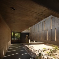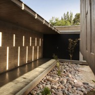 Casa Codina, Mendoza, Argentina La casa se sitúa en un terreno plano de 1500 metros cuadrados en un área residencial emergente dentro de la ciudad de Mendoza en la República Argentina. Una zona de clima típicamente continental, con grandes amplitudes climáticas entre estaciones donde la poca brisa proviene mayormente desde el Sur. El proyecto es una oportunidad para repensar la instalación de viviendas suburbanas en entornos emergentes en el espacio urbano latinoamericano contemporáneo. Entendiendo el espacio como estimulador, proponiendo geometrías sensibles a condiciones de clima y operando desde una conciencia sustentable. La casa se recorre siempre en relación a un patio central de carácter íntimo, abriendo los espacios principales hacia a un gran jardín perimetral de uso más público y una condición más húmeda. Los espacios principales se organizan con orientación norte de manera de obtener una ganancia térmica directa por asoleamiento, los espacios menores de carácter más íntimo, se orientan al este hacia un ámbito propio, dejando los servicios al oeste. Debido al movimiento natural de las masas de aire, el volumen de aire del patio central se eleva por temperatura provocando vacío y absorbiendo los beneficios ambientales del jardín perimetral a través de los espacios interiores de la casa. Una serie de elementos apoyan esta estrategia encausando las brisas del sur, disminuyendo la sección de paso y logrando una aceleración natural que apoya todo el sistema. El mismo recurso es utilizado en el patio central a partir de una pequeña abertura en el muro de hormigón. El gran tabique que emerge desde el patio central, con la misión fundamental de proteger la casa de la radiación solar proveniente del oeste, termina además resolviendo el ámbito de acceso. Para protección de la cara oeste se optó por un sistema de fachada ventilada con un material micro perforado, que a su vez resuelve la fachada principal de la casa. La búsqueda radica en encontrar contrastes, enfrentando un dramático ámbito de acceso desde donde es posible ver sólo suelo y cielo a un espacio interior abierto y profundo, donde pueden entenderse varias instancias visuales, donde todo parece estar en espacio y tiempo simultáneo… La materialidad del proyecto está dominada por un exoesqueleto de hormigón estructural a la vista realizado con tablas de pino cepillado que alcanza en el proyecto una expresión sutil y severa. El material microperforado de la fachada cambia su expresión dependiendo de las condiciones de iluminación. Los planos de guatambú lustrado natural, los tableros negros de las puertas y el resto de los materiales operan por contraste alcanzado acabados satinados y brillantes de manera de contrastar con la estructura principal. Codina House The house is situated on a flat land of 1500 square meters in a residential area within the city of Mendoza, Argentina. A typical continental climatic zone, with large weather amplitudes between stations where natural breeze comes mostly from the South. The project is an opportunity to rethink the suburban houses facilities in emerging environments in contemporary Latin American urban spaces, trying to understand the space as a stimulator, suggesting sensitive geometries that optimize weather conditions and operate from green conscience. The house is all around an interior central courtyard, opening the main spaces to a large lateral garden. These spaces are organized in a north orientation, gaining direct heat by solar radiation, the smaller and private space, are oriented to the east, leaving the services areas to the west. Due to the natural movement of air masses, the volume of air in the central courtyard rises, because of temperature, causing environmental benefits of the garden perimeter through the interior spaces of the house. A series of elements support this