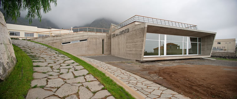 Casa de la Juventud de Los Silos, Tenerife, España El hormigón como placa tectónica que pliega la topografía e incorpora, mediante un gesto abrazador, una recreación de fragmentos de naturaleza, suelo y vegetación que se enroscan en un movimiento centrípeto, aglutinando los flujos visuales y espaciales de su entorno. El dinamismo volumétrico queda acentuado en las remarcadas estrías del hormigón, en las líneas fugadas de la rampa exterior o en el lucernario, el cual atraviesa diagonalmente el vestíbulo principal como un quiebro de luz que comunica espacialmente el interior con la terraza-mirador; los materiales, sus texturas y colores, se concibieron como elementos que mimetizan las impresiones naturales del lugar, sintetizados en el hormigón, la madera y la vegetación. El distribuidor principal se concibe como espacio ambivalente, con capacidad para ser absorbido por los espacios y programas que lo circundan; su espacialidad viene caracterizada por la singularidad del lucernario que lo atraviesa y por la transparencia visual que se acentúa mediante los paramentos acristalados del acceso principal y el que se dispone enfrentado a él, abriéndolo hacia el parque. La Luz va íntimamente ligada a las intencionadas aberturas practicadas en los elementos murarios de hormigón armado, que potencian su condición de contenedor. Cada una de las partes del proyecto adapta su relación con el exterior escenificando el carácter que posee cada función que se desarrolla en su interior, estando la espacialidad del proyecto íntimamente ligado a luz particular de cada ambiente. El envoltorio de hormigón, que aúna las funciones continuas de estructura y estética, permite a la vez expresarse de forma particular en cada una de las partes del programa. El diseño insiste en conjugar versatilidad, ambivalencia y permeabilidad , generando interrelaciones entre los espacios interiores y proyectándolos hacia el exterior; en lugar de diseñar el edificio como un objeto aislado, éste se concibe como vertebrador de los espacios circundantes, es decir, definiendo un nuevo espacio acorde y no simplemente ocupándolo. FICHA TÉCNICA NOMBRE DE LA OBRA: CASA DE LA JUVENTUD DE LOS SILOS UBICACIÓN: Avenida de Aregume, esquina Carretera del Cementerio , Término Municipal Los Silos, Isla de Tenerife, España FECHAS DE REDACCIÓN: AUTORES DEL PROYECTO: Lavin Arquitectos - Alejandro Lavín della Ventura, Francisco