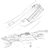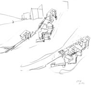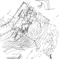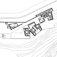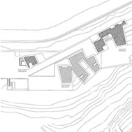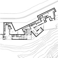 Este é o projecto de uma casa de Verão localizada em Maiorca, ilha do Mar Mediterrâneo. O sítio é caracterizado por uma forte pendente até ao mar. O acesso ao terreno é feito a noroeste, na parte mais alta, a cerca de 26 metros acima do nível do mar. Inspirado pelas paisagens rochosas circundantes, o projecto obedece a uma composição volumétrica fragmentada que se estende sobre a encosta até ao mar. O volume é composto por três grandes blocos, que se subdividem em várias partes menores. Constituídos por dois pisos mais cave, cada volume integra-se na topografia existente através de uma plataforma aos 22 metros. A ligação entre os volumes separados é feita por passagens desniveladas entre si. O Bloco Este, contém a entrada principal, o quarto principal, o quarto de hóspedes, assim como uma escada. A entrada principal da casa localiza-se no cruzamento da plataforma com o centro do volume, à cota 22,10m. O Bloco Oeste, funciona como o volume central pela sua configuração, alongando-se horizontalmente de modo a ligar os Blocos Este e Norte a nível do rés-do-chão (cota 18,60m). Este bloco tem três quartos no piso superior (cota 22,10m). Os quartos fecham-se entre si, criando um foco de luz num movimento vertical para o pátio ao nível inferior. Neste bloco também se pode encontrar uma sala de estar adjacente ao pátio. As suas fenestrações estão orientadas para o pátio, negando qualquer contacto visual com o mar. A proximidade do mar sem que este possa ser visto provoca um ambiente de introspecção na sala de estar. Por contraste, enfatiza as vistas do mar e da terra noutros compartimentos da casa. O Bloco Norte funciona como “casa do caseiro” e é constituído por dois quartos e uma sala. Apesar da sua simplicidade funcional, este volume desempenha um papel importante enquanto elemento preponderante de toda a configuração dos volumes no sítio. A.S. Projectista: Álvaro Siza Colaboradores: