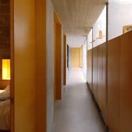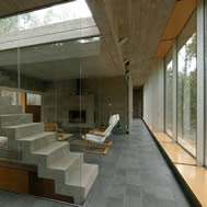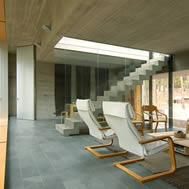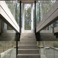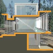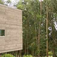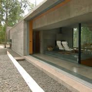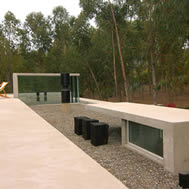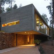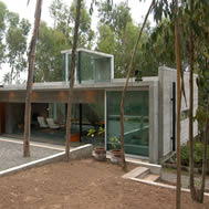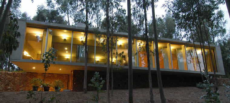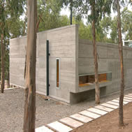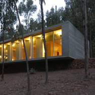 Casa Ómnibus, Gubbins arquitectos La casa Ómnibus está ubicada en la cercanía de la Quebrada de Aguas Claras, en lo alto de la entrada a Cachagua viniendo desde Laguna de Zapallar, en un terreno con suave pendiente y rodeado de altos y numerosos eucaliptos, y que enfrenta a la cadena de cerros que rodea Cachagua y Zapallar, con una vista lejana del océano Pacifico. La vivienda bajo la forma de un cuerpo horizontal rectangular de 23,5 m. de largo x 7,00 m. de ancho y 3,50 m. de alto, esta instalada sobre un zócalo, desde donde se ingresa subiendo al piso principal y a continuación al techo terraza. La vida y el espacio del ocio Con el fin de romper la estacionalidad que los recintos típicos de una vivienda presentan en general en la arquitectura urbana: cocina, estar-comedor, dormitorios, esta vivienda plantea una doble circulación que descompone esos recintos para constituirse en el día, mas que una suma de individualidades, en una suma de lugares complementarios entre si, dando origen a una forma de habitar lejana de la ciudad, y cercana al juego. La construcción de esta perspectiva longitudinal al interior del cuerpo, mediante la utilización de una cubierta de hormigón de forma irregular , aumenta la sensación de amplitud y continuidad de cada recinto con el total y el entorno, mediante transparencias, reflejos, luminosidad transversal y vertical. Habitar el exterior desde el interior Habitar el exterior en una vivienda de descanso se produce no solo a través del recorrido del propio lugar y el bosque, sino que a través de la casa, la cual ofrece a su vez y a través de su propia estructura y disposición, la posibilidad de redescubrir nuevas perspectivas desde la altura del techo terraza; desde la terraza posterior a través de la sala de estar; desde el corredor o galería junto a la fachada principal o cobijado en el zócalo. Una arquitectura con trazos de sustentabilidad La fachada principal de 23,5 m por 3,1 m de altura debido a su orientación norte, ofrece la posibilidad de transformarse en un gran captador de radiación solar que entregue en las noches la temperatura acumulada en el dia por la masa propia, pisos, muros y losas de hormigón. La construcción y la materialidad El uso del hormigón como aglutinador de una masa necesaria en el lugar, y su color, necesario complemento de los árboles existentes, abren la posibilidad de grandes luces y el uso de diferentes texturas, producto de los moldajes de tabla de la barraca del lugar.