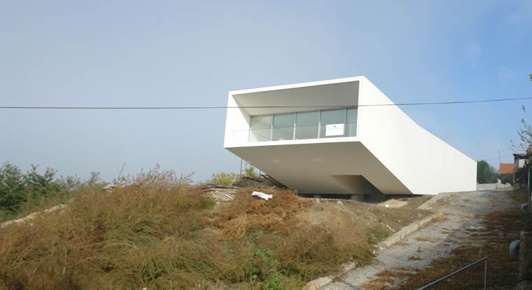Casa 1 Penafiel, Portugal La primera idea fue crear un volumen blanco de 29 x 10m. montado sobre un 'tapiz' continuo de césped. La segunda fue concebir la casa con 6 'fachadas': las 4 perimetrales + la cubierta + el techo del voladizo. Al bajar desde la cota alta por el sendero existente, el volumen baja y súbitamente se inclina y se proyecta hacia el valle. El estacionamiento se ubica debajo de la casa y del voladizo de 10m. En este nivel se ubica la entrada principal a la casa, a la que se accede a través de un patio que contiene un pequeño árbol, un espacio que actúa como un 'negativo en el centro del cuerpo'. Este patio, junto a otros cuatro, crean diferentes atmósferas y resuelven tanto cuestiones referidas a la circulación del aire y a los juegos de luz y sombras, como a las necesidades visuales y de espacios de contemplación. Los materiales: 1. Una piel, un cuerpo; 2. El material, blanco, con sencillo granulado y textura: a. en las paredes de la fachada, b. en los techos exteriores, c. en los pavimentos de los balcones, d. en los pavimentos de los patios, e. en la cubierta. 3. El límite del terreno es 'permeable' materializado con piezas verticales de madera de 6 x 6cm. 4. El sistema constructivo es Light Steel Framing.