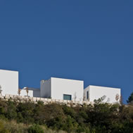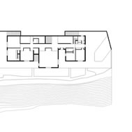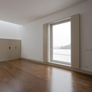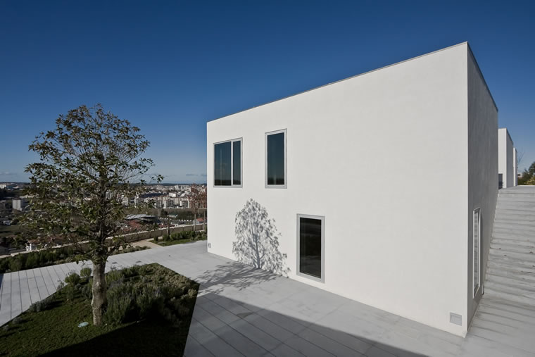 House in Pousos This is a two levels house that occupies an unleveled terrain, bringing just one level to the street front side. The house occupies a longitudinal band centered in the plot that defines to main gardens - one at the entrance and plain; the other one, near the scarp and facing the city. When arriving, only four volumes appear, welded together with a full straight lower level. This operation allows us to diminish the impact of the 815m2 construction area, and contributes to the organization of the house program. The four volumes also define several outside spaces that enhances the house living.