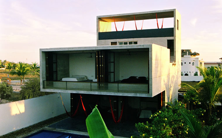El origen es el material Una casa fresca, para un calor fuera de los parámetros establecidos para el confort estándar de un urbanita; una casa con un mínimo mantenimiento y, si posible, de bajo coste; una casa flexible en el número de usuarios; y flexible en su uso y configuración; una casa que pueda abrirse completamente al exterior o cerrarse y concentrarse en sí misma. Una casa de playa construible en una esquina de mundo. Fueron las altas temperaturas, el salitre y la mano de obra poco especializada para ejecutar una técnica constructiva en un lugar remoto, los condicionantes que llevaron a tomar la decisión de que esta casa debía ser de hormigón. De hormigón son los puentes, los búnquers, las presas; y lo son por su capacidad estructural y por su resistencia a condiciones extremas. Este es el punto de partida para el arquitecto, y las posibilidades tectónicas y morfológicas del material, una ayuda en la definición formal del proyecto. La sección de la casa, con sus voladizos pronunciados, busca llevar al límite la expresión de estas cualidades, pero sobretodo, busca adaptarse a las condiciones específicas de su localización. Se definen 3 elementos para tres condiciones distintas: un cuerpo-torre, que en busca del mar rompe su opacidad en puntos específicos hasta conseguir una apertura total en aquella cota en donde ya nada bloqueará las vistas al pacifico mexicano; un segundo cuerpo, de habitaciones, suspendido sobre el agua y las flores del jardín; y un tercer elemento, construido con la voluntad de ser espacio central, amplio, alto, fresco, distribuidor y canalizador de las distintas actividades que se suceden en la casa. Son estos tres elementos los que se funden en un solo volumen; un objeto de escala confusa y textura rugosa. Pero es el espacio exterior construido, el umbral bajo el gran voladizo, el espacio más importante de la casa, el foco central de su uso. Este gran espacio tiene las condiciones de un espacio interior, disfrutando de las posibilidades de un entorno hecho a su medida: por un lado, vinculado al amplio núcleo central de la casa, bajo el amparo del equilibrio y el rigor del objeto construido; y a su vez, nutriéndose de la luz, el agua, el aire y con la posibilidad de estar cerca de la exuberancia de la vegetación tropical y sus colores que contrastan con la neutralidad del hormigón. Y todo esto, suspendido en las hamacas, reforzando la solidez de la estructura y lo suave de la forma de habitarla. Es la forma de vivir este espacio intersticial, la que define la voluntad arquitectónica final del proyecto: la vida en el exterior, abierta, en comunidad; una fotografía viviente de la utopía vital mexicana, es decir, un mundo de convivencia, de desorden, de color y naturaleza; un reflejo del vaivén de las hamacas, del placer del “dolce far niente”.