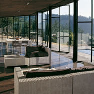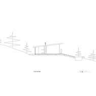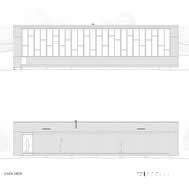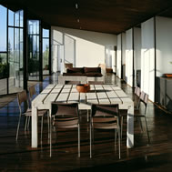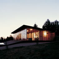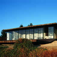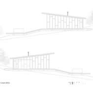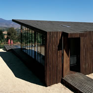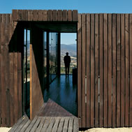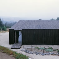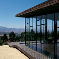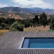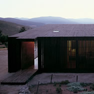Deck House, Alto Rungue, Chile - 2006 The sight towards the location of Rungue, displayed as a plane inclined looking the valley, having the Coast mountain range as background. The land suggested a large terrace, a platform from which it is possible to admire the overall scenery. The project starts having in mind a deck of wood. Over this platform would be incorporated the different areas of the house. Nevertheless, the resources were exclusively aimed at this terrace, and the interior space was enough only for a large living area incorporated to this terrace. It was decided, therefore, to assign almost all of these resources to resolve the housing based on two main components: a deck and a living area, being this later one capable of absorbing the kitchen, the dinning room, and even the master bedroom. Additionally, considering that in a summer holiday house dormitories are only used to sleep, it was decided to eliminate this concept, changing it for “a group sleeping area” at which the space aimed at dormitories almost fully disappears from the project. By means of a folding of this deck is achieved a match with the inclination of the land, and at the same time, the space aimed at housing, is confined. Then, the outside area is worked as a free zone that rests over the relief and the interior as a capsule of glass incorporated to the folding of this wood board. The interior, likewise, was longitudinally divided in two through a wide wall of services, to which it is incorporated the kitchen and bathrooms, besides a set of beds in three levels, towards the back side of the house. These two spaces then turn into a large family living room, dinning room and kitchen on the one hand, and a hall-group sleeping area with beds, on the other. The board of wood this deck generates runs along all the house, from the lowest part, - where a swimming pool has been added – to the upper cover, turning into the roof, showing since the first glimpse to the house, the use of wood everywhere. The main deck, which includes the pool, lefts an inclination, due to the slope of the land that looks towards east, as if it were a chaise longue of the full size of the housing, that gives space to the body in resting position, as if it deals with a large chaise longue. A second deck is the roof of the house, inclines to the opposite orientation, serving this time as a solarium, towards the west of the site.