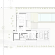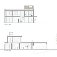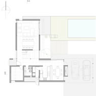 Casa Film - Funes Hills Cadaqués - Santa Fe - Argentina / I + GC [arquitectura] - Matías Blas Imbern + Agustina González Cid La Emplazada en la ciudad de Funes (santa Fe, Argentina), dentro del barrio cerrado Funes Hills Cadaqués y presentando las ventajas características del asentamiento suburbano, la obra busca lograr el contacto permanente interior-exterior, tan deseado por la gente que elige vivir en dichos lugares. La casa, concebida para una familia joven con hijos, se resuelve a partir de una estrategia simple: el empleo de dos cintas -films- que a modo de planos plegados la implantan en el terreno, la organizan programáticamente y definen la identidad formal de la obra. Estas van a ser las encargadas de dar unidad a la totalidad de las partes. La disposición de las mismas en L, abre la vivienda hacia las mejores orientaciones, buscando la fluidez espacial hacia el interior del lote. La pileta, ubicada en el centro del conjunto, fue pensada como el corazón alrededor del cual se dispone la totalidad de los locales y el parque, convirtiéndose de este modo en protagonista de la vida de la casa, a la cual miran todos los espacios de la misma. A su vez, la implantación de esta permite liberar una importante superficie de terreno para el desarrollo de actividades deportivas y/o recreativas. Todos los espacios comunes de la vivienda se disponen en planta baja, privilegiando el contacto directo con el terreno en los ambientes más dinámicos -living, cocina, comedor, quincho-. En la planta alta se ubican los dormitorios, favoreciendo la intimidad y las visuales elevadas por sobre el manto verde del country. El ingreso principal se produce a través de un hall en doble altura que aloja la escalera y genera una verdadera continuidad visual del terreno a través de su transparencia, produciendo una sensación de atravesamiento entre el frente y el parque. Este espacio vertical articula en la planta baja la relación entre los servicios y el estar; y separa en la planta alta el mundo de los padres del de los hijos, otorgando un nuevo nivel de privacidad. Una de las innovaciones funcionales que introduce el proyecto es el uso del retiro sur para el ingreso vehicular, ubicando de este modo la cochera en el centro del terreno. La misma puede funcionar también como quincho, en contacto directo con la cocina comedor, con la pileta y con el parque; y en el futuro como una posible expansión de la vivienda, desplazando el espacio de estacionamiento a continuación. Para los cerramientos se utilizaron volúmenes y planos apelando a una variedad material de modo de no afectar el juego formal propuesto, en donde las cintas grises son protagonistas y el resto se subordina hacia éstas; disponiendo a su vez las aberturas dentro de un juego de llenos y vacios entre los distintos componentes.