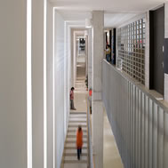 CEIP Ferrer i Guàrdia. Granollers, Barcelona / Jordi Badia - BAAS Arquitectes La escuela se divide en dos partes, el aulario y un cuerpo bajo destinado a comedor y gimnasio. El aulario se ubica en una barra entre medianeras y alineado con la calle Roger de Llúria que se cierra a la calle y se abre al interior mediante el filtro de unos patios que controlan la luz natural y construyen una serie de volúmenes vacíos de 3 plantas de altura, usados como patios infantiles. Una escalera lineal comunica las tres plantas y construye un espacio interior que se convierte en protagonista, cosiendo las tres plantas en un solo volumen que recibe luz filtrada a través de una sucesión de aberturas ritmadas verticales. En la fachada a la calle esta solución se combina con la voluntad de enfatizar la opacidad de este cuerpo, marcando sólo en planta baja el acceso independiente de la escuela infantil con un movimiento de la fachada que genera una dilatación de la acera. El acceso principal a la escuela se produce desde el patio principal por un porche que une el aulario con el cuerpo de servicios y a la vez compartimenta el patio de una manera natural entre infantil y primaria. La escuela se construye en bloque de hormigón blanco con junta vertical y una serie de celosias también de hormigón en solución de continuidad interior y exterior que configuran el lenguaje del edificio. La densidad y calidad de las imágenes interiores de algunos edificios de Aldo van Eyck y Hetzberger nos acompañaron durante todo el proceso.