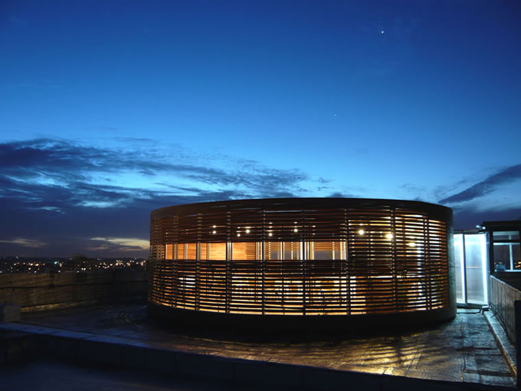 Comedor P11, Universidad de Morón El comedor para el personal administrativo en el piso once de la Universidad de Morón (Argentina), es en realidad un hibrido, un mestizo hijo de distintas corrientes; Amamantado por Heidegger y educado por Abalos y Herreros o viceversa, nace mitad artefacto y mitad cabaña. Se ubica en el lugar que toda pieza de azotea posee, un elemento liviano de fácil montaje y similar desmonte, de piel tramada, vegetal y permeable, como un filtro de aire, de luces y de vistas; No interrumpe de ninguna manera el libre circular de las aguas y controla su permeabilidad a los vientos según sus propias necesidades climáticas. Una sala de máquinas, un equipo de aire acondicionado, un tanque de agua, un compresor, un conducto de ventilación, etc, etc… Preciso, pero de rasgos telúricos, por sus coqueteos con una materialidad autóctona, y por su dialogo con espacios que no son ajenos a nuestra cultura, el quincho, el patio, la parra y la sombra; El comedor pertenece y resume en él la lógica de la cubierta urbana; un conglomerado de artefactos que se mezclan con la necesidad humana e irremplazable de expansión y de verde en una ciudad densa. Es en si mismo un autentico “artefacto azotea”. Autónomo como pieza, como espacio protegido, ajeno a lo circundante y con clima propio, para que el cuerpo se alimente y la mente se distienda a pesar de estar flotando en un mar de membrana asfáltica… Ficha técnica Obra: Comedor para personal –Universidad de Morón Autores: Estudio Borrachia arquitectos - Oscar A. Borrachia -Alejandro H. Borrachia Colaboradores: Edgardo Litovich, Arq. Leonardo Esteves , Mariano Mendoza , Maximiliano Mazzitelli , Ariel Asione Ubicación: Cabildo 134 Morón, Provincia de Buenos Aires Superficie: 80 m2 Año de construcción: 2009