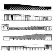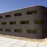 concrete bay structure in a rough skin of black bricks. These
