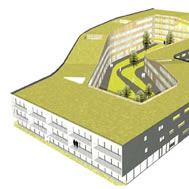 to its sloping roof and curvaceous shape, the block not only contains