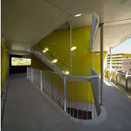 galleries and the exterior walls of the apartments, clad with yellowish-green