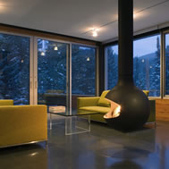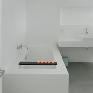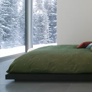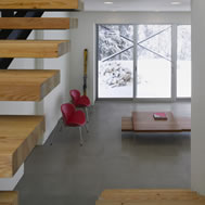 Hiller Residence, Winter Park - Colorado The client, Ruth Hiller, a fine arts painter and corrective exercise specialist, purchased a 1950's single storey home located in Winter Park, Colorado. Ruth, a single woman, approached Michael P. Johnson Design Studio Ltd. with the challenge to remodel this poorly designed building in a manner within a minimalist design ethic. With little to work with it was suggested that the existing residence be removed and relocated elsewhere. Working with the existing basement foundation a two storey solution allowed the living, dining, and kitchen to fly above the dense evergreen forest. The lower level, contains two master bedroom suites, entry and a commons room. The basement was designated for use as a painting studio with natural light borrowed by the use of light wells located on the west elevation. A 44.5 cm. X 44.5 cm. full body porcelain tile was selected for its beauty and durability for the entire lower level. The use of a single tile color unifies the total space allowing the free flow from room to room. The use of porcelain tile in my projects is not of a decorative nature but as a building material. I use large format tile to function as a platform for the modern furniture and art work prevalent in all of my work.