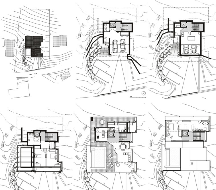 | House D - Velenje, Slovenia - SVA (Jurij Sadar, Boštjan Vuga, Miha Pešec, Adrian Petrucelli) On the topography of the steep ground, five construction strips with different cladding fillers create four different exterior fronts of the House "D". An abstract front with strips, which closes the view towards the east, a Californian front, with a bold console of the ground house, a Provanse front, where the house opens towards the pool, terraces and green surroundings. The fourth front of the house is a local one and it creates the relationship between neighbouring houses. All the above-mentioned house fronts pass on from one to another with interlocking, where two fronts merge without loosing their own adjacent character. A cinematic sequential experience is therefore created. The diversity of four house fronts extends into recognizable micro-ambiences which give the house its identity: the garage, camouflaged into ground, house entrance below the pool console, the reflex of the environment in the large reflecting glazing of the front, fluid living-room space, which is illuminated by notches between strips, kitchen protruding towards the outside, which divides shade and sun terraces, bathroom and bedroom, joined by the terrace… The House "D" is implemented into a very generic Slovenian semi-rural suburubia. It creates an ambigious, soft relation to typiccal double-pitched roof, not-too-big-windows and at-least-one-balcony houses in its direct sourrandings. Steel framed upper part with a plateu of living-swimming-entertaining is suspended on the green painted, green grown concrete plinth. Approaching the site, the house is perceived from underneath. A very cinematic sequence which underlines the house particularity in the sourrandigs. You can imagine the client’s family enjoying sunbathing on a pool deck, high above roofs of neighbouring houses, with an arcadian view to a hilly landscape of Slovenia.