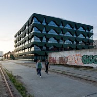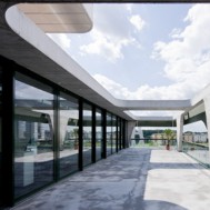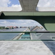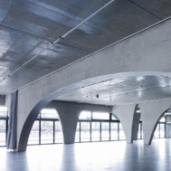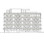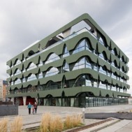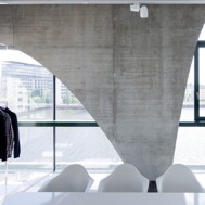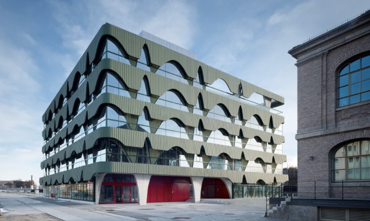 High Fashion Exhibition Centre Labels Berlin 2, HHF Architects The fashion center Labels Berlin 2 is a concentration of showrooms for international fashion brands in one building including public spaces such as an event hall, a restaurant and a lounge at the top floor. The design strategy is based on the adjacent warehouse building Labels 1. The interior spaces of this historical building are strongly characterized by the repetition of arched windows used in the façade. This motif became one of the starting points for the design of the project. The use of two differently cut sine curves generates a specific aesthetic for both the supporting structure and in a modified form with the sine waves for the façade. The result is that the structure and rhythm establish the formative motif for the perception of the new building and link it to the existing neighborhood. Connected by a heat exchanging device, the whole concrete structure of the building is permeated with water tubes and used as a radiator for heating as well as for cooling. The energy consumption for heating and cooling of Labels 2 Berlin is reduced by 40% due to this combined technique of activating the building mass and using water from the Spree River. HHF architects won the international competition among selected architects in September 2007. The building opened in Spring 2010.