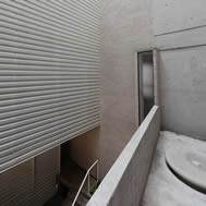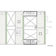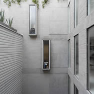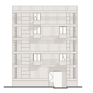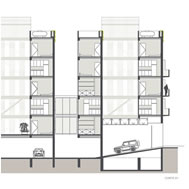 Lisboa 7, México DF - at. 103 El nuevo corredor reforma propone un esquema de re-densificación en la zona: Departamentos de lujo, m2 de oficinas tipo A y comercio. Pero, ¿qué pasa con lo que queda detrás? (a) Las cuadras posteriores al corredor en las diferentes colonias como: Juárez, Tabacalera, San Rafael y Cuauhtémoc, serán afectadas por estos desarrollos, éstas cuadras servirán naturalmente como zonas de apoyo y servicios del lujoso corredor. Para evitar la gentrificación en la zona y aprovechar mayor los espacios que quedan en estas colonias o los huecos que existen desde los terremotos de la ultima mitad del siglo 20, es necesario desarrollar vivienda de nivel bajo y medio, que sirva de contrapeso al Paseo de la Reforma y ayude a evitar recorridos largos de la gente con ingresos menores que trabajarán en estos nuevos edificios. Estas cuadras, deben de verse como parte de este esquema formando una simbiosis, alimentándose mutuamente en vivienda y servicios, unos de lujo y otros de necesidades básicas. El proyecto logró identificar un conjunto de variables de diseño permitiendo que la vivienda se valorice en el tiempo, y la zona mejore integrándose al tejido social existente. Se desarrolló un edificio lo mas denso posible que permitiera financiar el predio que anteriormente era un estacionamiento. El edificio funciona por medio de seis placas de 3.60 metros de ancho y seis patios de iluminación para dar una máxima superficie de fachada oriente-poniente la cual nos permite ventilaciones cruzadas y mejor iluminación a los departamentos mas bajos. Todos los espacios habitables ven al poniente, la fachada oriente es cerrada casi en su totalidad para permitir la privacidad de los espacios (d). En vivienda saturada es importante la calidad de los espacios, iluminación y vistas, la fachada poniente es un jardín vertical con plantas que cuelgan de las terrazas. El proyecto tiene 60 módulos (e) de 36m2 (medida mínima de vivienda en México). En este ejercicio se mezclaron 4 tipos de vivienda, desde 36 m2 (1módulo) hasta 144m2 (4 módulos) (f) dando la oportunidad de incluir créditos para la vivienda mínima o para vivienda media. El edificio de 5 pisos tiene solo dos pasillos de circulaciones horizontales, en el piso 2 y 4, se accede a las unidades en estos pisos que tienen 2 (g) y hasta 3 pisos dependiendo de los módulos de cada unidad, la unidad es habitada como pequeñas casas verticales. Cada módulo es de planta libre y tiene un muro húmedo para servicios como cocinas y baños (h), los cuales se pueden programar dependiendo de las necesidades de cada usuario. Los materiales que se utilizan son materiales que no necesitan de maquillaje adicional, concreto y block de cemento aparente.