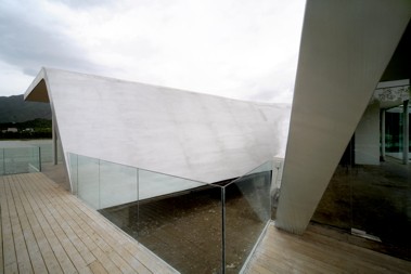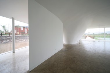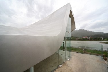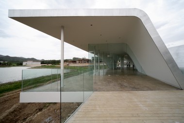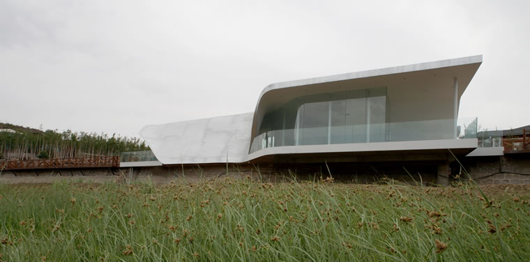 Hong Luo Club House / MAD Office, Beijing, China (2006) The expansion of Beijing city has intensively accelerated the development of its periphery area for the last few years, which thereby helped develop the first space typology in China. In the meantime, the suburbia emerged gradually. Enclosed by grand natural environment, Hong Luo Villa district is a popular residential area in north Beijing‘s Miyun-district, which is within one hour’s drive away form the heart of the city. As Hong Luo’s popularity keeps growing, the promise of its rapid development in the foreseeable future has attracted huge investment into the district. Hong Luo Villa district is a three-phased project. The sites for each phase are allocated along Hong Luo Lake, reflecting the grand view of the mountains sitting behind it. Hong Luo Club floats on the lake, creating an easily accessible public space at the center of the district. A wood bridge was introduced as an access to the Club House. The house has two branches, one is a swimming pool floating on the lake, the other is an underwater platform. The architectural form is shaped by people’s circulation. Two major roads converge at the center of the house and reach all the way up along an ascending roof. The ever changing water surface joins the ascending roof, expressing the transition from liquid to solid. The space structure and the functions of the house are integrated naturally. The main access to the house will bring the visitor to 1,300 mm under water, where people feel like walking in the lake. The access road ascends to the ground level gradually as it nears the house, which reveals the main function of the building -- a gathering space. The roof shape is a projection of the linear, functional organization of the ground level’s program. The outdoor swimming pool is built into the lake, which keeps the surfaces of the natural and the artificial water at the same level. The architecture explores the city dwellers’ understanding of the nature. Hong Luo Club House creates an ever changing space that echoes with the surroundings, where people and the nature are united. The mountain and the water provide hope and inspirations for people who live in concrete woods.