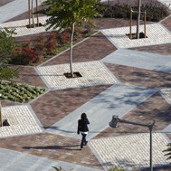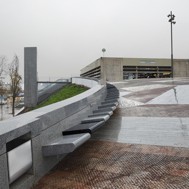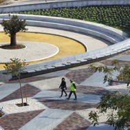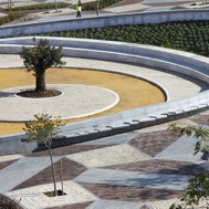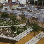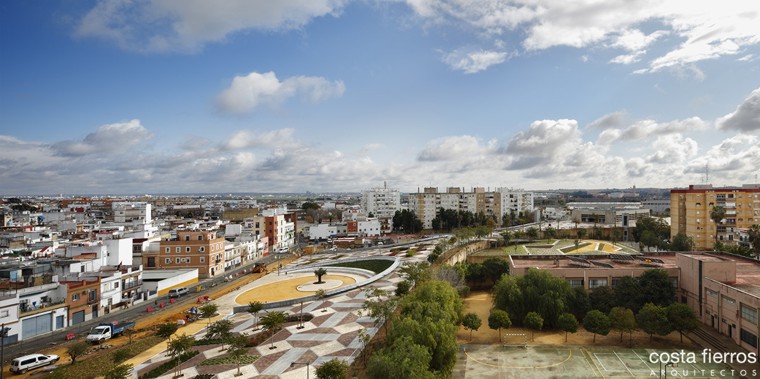 ADECUACIÓN URBANA DE LA ESTACIÓN COCHERAS DE LA LÍNEA 1 DEL METRO DE SEVILLA. NUEVO PARQUE DEL BARRIO DE LA MÚSICA Estado anterior La parcela en la que se sitúa el Parque ha sido durante muchos años una zona degradada y sin equipamiento alguno, un histórico descampado que ha dividido a los barrios de su entorno (barriada de las Águilas y los Prunos) y aislado a sus vecinos. Antes de las obras de la línea 1 del Metro estuvo ocupada por las antiguas instalaciones de los cocheros de caballos de Sevilla, albergando también en su momento las obras del proyecto del metro de la década de los setenta. Con motivo de la planificación de la ejecución de la Línea 1 a su paso por estos barrios, se analizó la oportunidad de revalorizar el entorno de la estación con un espacio público de calidad. La estación de Cocheras, inaugurada en 2009, está semisoterrada y el metro (subterráneo) requiere una gran pendiente para que los trenes alcancen su cota y luego puedan subir a superficie por encima del viaducto de la SE-30. El túnel de hormigón que alberga las vías se eleva hasta una altura máxima de 7 metros, comportándose como una contundente barrera física entre los barrios. Objeto de la intervención El Parque de la Música constituye una de las actuaciones singulares en materia de reurbanización e integración urbana asociadas a la infraestructura de la Línea 1 del Metro de Sevilla, que se iniciaron en enero de 2009. En su gestación (2006-2008) se desarrollaron los anteproyectos y proyectos constructivos, con la participación activa en su diseño de las asociaciones de vecinos de los barrios de su entorno (barriada de las Águilas, los Prunos). Entre las principales aportaciones vecinales incluidas por la Consejería de Obras Públicas y Vivienda (administración promotora de esta actuación, a través de la Agencia de Obra Pública de la Junta de Andalucía) en el proyecto definitivo, figura la incorporación de los medios mecánicos de acceso para dotar de una mejor y más óptima permeabilidad tanto el acceso a la estación como el paso transversal entre ambas barriadas. La intervención, que se levanta sobre una superficie total de 32.487 metros cuadrados, garantiza la accesibilidad a la estación de Cocheras, situada en la meseta central del Parque, así como el paso de los vecinos entre las viviendas que se sitúan a uno y otro lado de la estación. Contribuye al disfrute del paseo y de los ámbitos reservados para el descanso y la contemplación del nuevo paisaje creado; así como para posibilitar la continuidad de los itinerarios urbanos, haciéndolos accesibles y cómodos para todos. Por lo tanto se persigue un doble fin: una ciudad más cohesionada, regenerada, con mejores relaciones internas, y una ciudad más humana y agradable en sus vivencias cotidianas. Descripción de la intervención El espacio lo organiza un gran recorrido Norte-Sur que, en suave rampa, permite alcanzar la cota de la estación. A este recorrido longitudinal se van vinculando otros transversales que parten de entre las plazas y calles. En el margen Este la diferencia de nivel se salva mediante calles que ascienden por el terreno formando taludes que protegen las plazas a cota de barrio. Junto a la entrada de la estación está ubicado uno de los ascensores y la escalera mecánica. En el lado Oeste la diferencia de cota se resuelve con un muro paralelo al túnel del metro y se desarrolla en curva hasta definir la entrada principal oeste al recinto con una rampa. En el encuentro de la calle peatonal Águila Marina con Águila de Oro se encuentra el otro ascensor. La pavimentación realizada con materiales de primera calidad (piezas cerámicas, adoquines calcáreos y granito) cuya geometría se repite sistemáticamente como un tejido que va atando los distintos espacios. Este patrón proviene de un tramo de azulejos existentes en el Patio de las muñecas de los Reales Alcázares de Sevilla. Entre las figuras geométricas de esta trama se encuentran rectángulos de 6x2m que se rellenan de tapizantes a modo de alfombras, pero manteniendo siempre la vista libre de obstáculos, de modo que la sensación de seguridad y confianza prime en cualquier rincón. Las tapizantes también rellenan de color y textura los taludes que arropan las plazas giradas a este. El muro curvo con 274 metros de longitud y con una altura máxima de 7 metros se transforma en un lienzo vegetal al estar compuesto por 24 variedades de 18 especies de trepadoras, elegidas minuciosamente, según su localización, orientación, compatibilidad, color, olor, etc. Dos centenares de árboles de 23 especies
