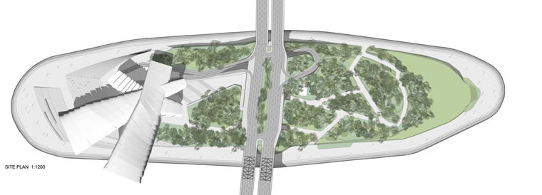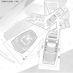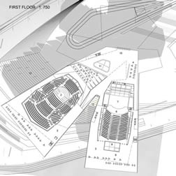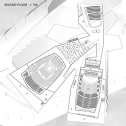 Center' Al asistir a un concierto, una experiencia mucho más rica y más amplia que la estrictamente musical se presenta al espectador: el entorno físico, al mismo tiempo que la atmósfera social, genera un conjunto de sensaciones y emociones que crea resonancias, ecos, procesos de iteración, refuerzo u oposición con respecto a las emociones producidas por el espectáculo en sí mismo. Escuchar una determinada pieza musical puede constituir una experiencia completamente diferente en distintas ciudades, salas de concierto, épocas, e incluso en distintas funciones de los mismos músicos y en la misma sala. Concurrir a un concierto implica un complejo juego social en el que uno mismo es observado mientras mira, a su vez, a otros que escuchan la música o llegan al concierto, como en un complejo juego de espejos o en una pintura barroca. Durante el transcurso de los siglos XIX y XX, los edificios destinados a albergar manifestaciones artísticas montaron este juego de diferentes maneras, partiendo de permisas determinadas, tanto ideológicas como políticas; la amplitud de planteos posibles puede observarse, por ejemplo, en las dos óperas de Paris: la reciente restauración del edificio de la Opera Garnier y la Opera Bastille de 1980. Nuestra propuesta para The Seoul Performing Arts Center intenta celebrar esta experiencia voyeurística del edificio de conciertos, al tiempo que incorpora nuevos elementos que contribuyen a enriquecer la vivencia de asistir a un espectáculo considerada en su totalidad: por un lado, percibiendo todo lo que está involucrado en la producción de una ópera o de un concierto, y, por el otro, interactuando con el paisaje que rodea al edificio. Los teatros de Ópera tradicionales están claramente divididos en dos áreas separadas: una pública, dedicada a la representación del concierto, y una privada, donde se lleva a cabo su producción. De hecho, podemos pensar en los más famosos teatros de Ópera del siglo XIX como si estuviesen constituidos por dos edificios vinculados entre sí mediante el escenario. Brevemente descriptos, uno es la puesta en escena de múltiples juegos: estilos y órdenes arquitectónicos, materiales y decoraciones, espacios interconectados a través de majestuosas escaleras, jerarquías sociales y voyeurismo. El edificio de la producción y la fabricación, por otro lado, permanece como una compleja red de talleres y corredores, con poca o sin ninguna conexión con el mundo exterior, escondite de fantasmas en la imaginación de los escritores del siglo XIX. El resultado es un edificio donde todas las actividades diarias (ensayos, diseño y construcción de escenografías, etc.) se desarrollan en tiendas cerradas, mientras los más grandes espacios permanecen reservados para ocasiones excepcionales. Nuestra propuesta intenta celebrar tanto la producción del concierto como el desarrollo del mismo, como se puede observar en la volumetria del edificio, donde los halls principales, las pequeñas salas de teatro y salas de ensayo, los talleres y las oficinas constituyen una serie de volúmenes unidos e interconectados que exponen estas actividades de una manera no jerarquizada. La Opera House y el Concert Hall vuelan sobre el extremo oeste de la isla, logrando que los eventos principales sean visibles desde los bancos del río y desde el Broadcasting Center. En otra escala, talleres, oficinas y salas de ensayo se proyectan en diferentes direcciones, permitiendo que estas actividades también puedan ser observadas por las personas que cruzan el río a través de los dos puentes. De este modo, además de proponer una nueva manera de expresar el carácter de un centro de representaciones artísticas, la vida y el uso diario del edificio son privilegiados con la mejor iluminación natural y las mejores vistas, generando un reconfortante entorno de trabajo para músicos, bailarines, artesanos y administradores por igual; y todos estos espacios se vuelven parte de la experiencia del edificio en los días de eventos artísticos.