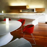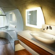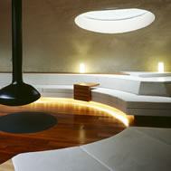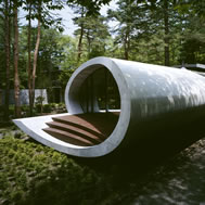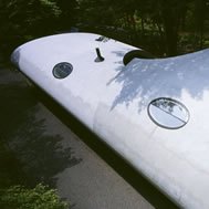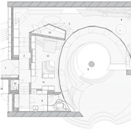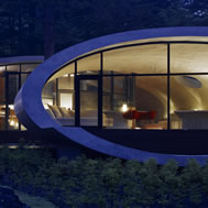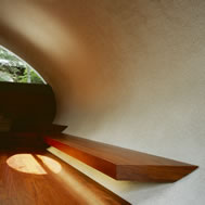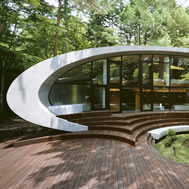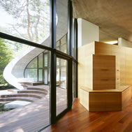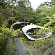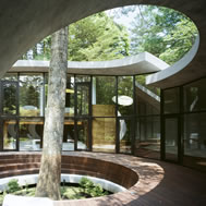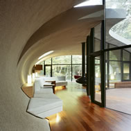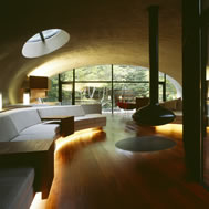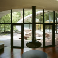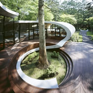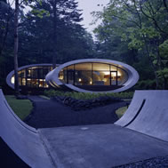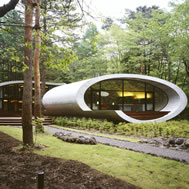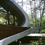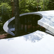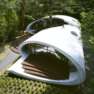 Shell House, Karuizawa - Kitasaku - Nagano, Japan The plan was to build the villa around the big fir tree as the center of the site, with a row of pine trees as the main view. Initially, we had planned to build a shell structure with three dimensionally curved surfaces, and the C shaped section was to surround the fir tree and the plan of the building resembled the letter J In addition, certain parts were planned to hold double volume space. Yet, going over the budget, construction method and finish, the plan was revised down to a shell structure of two dimensionally curved surfaces. The J shaped structure is constructed by two different size oval cylindrical masses cut with curves. The straight part of J, a smaller mass connects to a curved part to J, a larger mass. The top of the oval shaped building wall thickens by 350mm and its width continuously increases up to 750mm at both sides to meet the structural requirements. The free-curved lines appear on the edge, and the three dimensionally curved surface with a twist partly appears on the cut surfaces. However the entire structure was composed by two dimensionally curved surfaces. The floor is built 1400mm above the ground, with the lower half of the shell structure protruding greatly towards the outside, supporting the terrace of the same height. All air and exhaust outlets are installed beneath the sash, letting air run outside through the terrace louver. In addition, by devising unfixed windows, we tried to maximize natural ventilation (we haven’t arranged air conditioning in general parts). While at a glance, the oval shaped cylinder space might appear as wasteful use of space, the functional use of space is maximized by the installation of furniture in the lower half of the oval cylinder. Description of air conditioning system >>> Considering the often short and intermittent use of villas, the expanded hard urethane form has been installed to cover 60 mm of the interior wall of the oval cylinder, which will reduce thermal capacity. As for the interior finishing touch and for adding surface strength, synthetic resin with vermiculite material sprayed directly on the urethane form surface was the choice. Often the type of finish seen on the back of panels, it is efficient in preventing fire, absorbing sound, and insulating heat and moisture. As previously mentioned, the warm air in-floor heating system has been installed. By dividing the oval section with a flat floor, a bow shaped space will appear on the bottom of the oval, which will serve as a heat chamber and be filled with pipes. Warm air that blows from locations of frequent use will efficiently heat the flooring. Eventually, the warm air will also be released through slit installments by the window, preventing cold drafts. At times of absence, if the temperature drops to freezing point, an automatic system installed beneath the flooring will run its antifreeze procedure. Since the system first heats the plumbing space, and as a result, the antifreeze procedure is run by dramatically reduced energy. The system was further customized by adding a dehumidification and ventilation drive, which runs by automatic operation throughout the year. The efficiency of this system is truly remarkable.