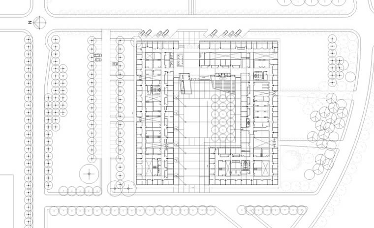 Memoria descriptiva La propuesta plantea una estructura de alto nivel de flexibilidad. Un contenedor de planta profunda con un gran patio central, que permite gran variedad de cambios en la organización de los sectores internos. Estos sectores pueden cambiar internamente, crecer a expensas de otros que se achican, o adaptarse a variaciones organizativas en el tiempo, sin alterar el orden planteado para el conjunto del edificio. La continuidad de la superficie de la planta y de sus sistema circulatorio supera en este sentido las limitaciones y rigideces de las organizaciones por pabellones. Un sistema de bandas paralelas concéntricas, con oficinas en los bordes exteriores y laboratorios en el centro, es atravesada, casi de manera aleatoria, por pequeños tajos o patios, a veces internos, y a veces conectados con las fachadas, de modo de permitir el ingreso de la luz y el verde en el interior del edificio. La posición casi aleatoria de estos patios produce una gama de contextos de trabajo siempre diferentes y por lo tanto claramente identificables Las pieles exteriores son siempre vidriadas de piso a techo cuando están en contacto con el patio principal y en los patios más pequeños, de modo de plantear una planta diáfana, con diferencias sutiles entre el interior y el exterior. Los ajustes al programa pueden producirse en la etapa de proyecto, cambiando de lugar estos patios, sin alterar la estructura general de la propuesta. El patio central, con una galería perimetral, permite un sistema múltiple de relaciones entre los distintos sectores a través de un espacio exterior controlado. En el cincuenta por ciento de su superficie, un pequeño macizo de árboles provee de sombra a la fachada norte, y actúa como regulador de la luz hacia el interior. Sobre el lateral sur del patio, una línea de aerogeneradores de energía eléctrica plantea la necesidad de comenzar a pensar tecnologías, inagotables y no contaminantes, alternativas a las tradicionales no renovables. Esta idea se refuerza con la inclusión de colectores solares sobre la terraza, para la provisión de agua caliente.