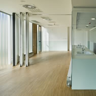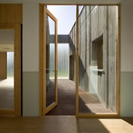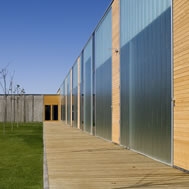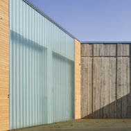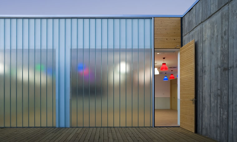 Escuela Infantil Santa Isabel, Zaragoza (España) La Escuela Infantil de Santa Isabel se presenta como una pieza geométrica, optándose por una construcción in situ. El proyecto se concibe en planta y en sección como dos grandes cajas de hormigón, vidrio y madera en cuyo interior se albergan por un lado el programa educativo (aulas, dormitorios y sala múltiple) y por otro los servicios (sala profesores, comedor, cocina e instalaciones). Las cajas se cierran a norte protegiéndose de las inclemencias meteorológicas y la calle. Por el contrario, hacia el sur se abren mediante un paño de U-GLAS con carpintería de madera y vidrio buscando el soleamiento y la visión del patio de juego. En la medianería entre aulas se plantean unos patios menores que ofreciendo áreas de juego acotadas, permiten una visión longitudinal del bloque de aulas. El encofrado de la envolvente de hormigón, se realiza mediante tablas de madera de distinto formato marcando un despiece vertical en el cerramiento. Todo ello procura que la textura de la envolvente de hormigón no pierda la calidez de la madera del encofrado iniciando un juego con el U-GLAS. El acceso principal del edificio se produce por la fachada oeste, (C/Iglesia), encaminándose a la franja de unión de las dos cajas (educativa y de servicios). Los accesos de peatones al Centro Infantil y vehículos se encuentran diferenciados, siendo también independientes las circulaciones de niños y educadores, respecto a las de mantenimiento e instalaciones. El proyecto procura la versatilidad y plurifuncionalidad de las aulas. Éstas se separan mediante sistemas de tabiquería móvil que permiten la unión de las dos aulas para niños de la misma edad en una, posibilitándose un programa educativo diferente y apto para más alumnos. A ésta disposición se han adaptado los cambiadores, aseos y dormitorios que funcionan bien para las aulas estándar y para la fusión de éstas en una. Por otra parte, la cota 120 aplicada a las alturas, define en todas las estancias el límite entre el espacio adaptado al niño y el del adulto. Este mecanismo de la existencia de una línea de “nivel” permanente a 1,20 m será determinante en la vida del edificio fijando la posición “no al alcance de niños”. La consideración del material hasta 1,20 m como rodapié, refleja con claridad los criterios de limpieza y fácil mantenimiento. La madera tiene una presencia determinante en el juego compositivo, no solo por los distintos usos en carpinterías y suelos tanto interiores como exteriores, sino también en el recuerdo y ausencia que se dibuja en la textura de los muros de hormigón realizados con encofrado de tablas. Interiormente la omnipresente tarima industrial flotante dota a los suelos de la calidez y resistencia necesaria en un pavimento para niños, orientandose a modo de guía longitudinal del edificio recibiendo y uniendo a su paso las carpinterías de madera interiores y exteriores en sus diversos formatos. Exteriormente la linealidad del entablonado potencia los juegos compositivos a veces contraponiéndose, como en el entarimado de las puertas, otras trasponiendo el ritmo de la fachada al pavimento, del U-Glass a la tarima de exteriores, y otras dotando de vida al hormigón imprimiéndole una textura de vaciados que deletrea su método constructivo.