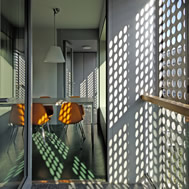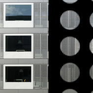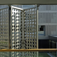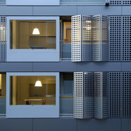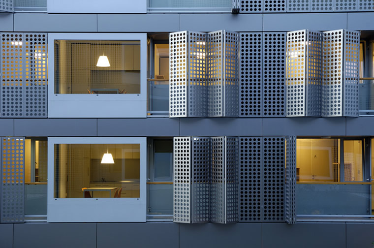 Student Housing Poljane, Ljubljana Student Housing project by Bevk Perovic Arhitekti is a building on the edge of Ljubljana city centre, near the river bank, comprising of 56 dwelling units for students of Ljubljana University. It is a building of high programmatic clarity – a series of public programs (spaces for teaching, communal living and leisure) are concentrated in a horizontal transparent base – while series of student living units hover above in two slabs. Student units are organized around central service cores containing bathrooms and kitchen/dining rooms, which appear on the elevation of the buildings as huge openings – windows like 'eyes', overlooking the street. Adjoining student bedrooms are, in turn, screened from the street by series of folding panels in aluminium, intricately perforated, protecting private lives of inhabitants from the street bustle.