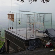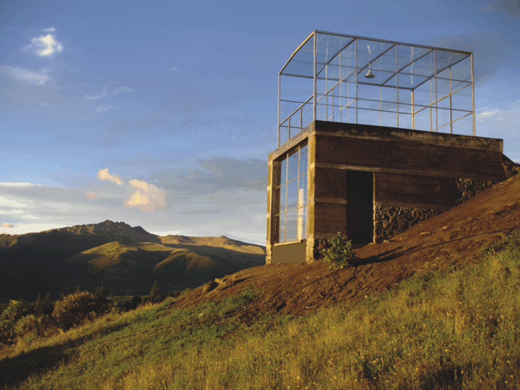 Taller-Invernadero, Machachi – Ecuador / al borde – Pascual Gangotena (2006) Él requiere un refugio para llenar sus cuadros con el potente reflejo de la naturaleza; Ella, uno para resumirla en un invernadero. Él es el sustento de su familia, Ella, la pasión, la ternura y la ilusión. Para Él, un taller que se convierta en un espacio de inspiración y abstracción, una burbuja desde la cual observar la naturaleza y plasmarla en sus cuadros. A su vez este taller se convierte en un pedestal sobre el cual se ubica el invernadero de Ella. En su interior, el invernadero compila una selección de flora y se convierte en un lugar de contemplación de la inmensidad del paisaje. Dos atmósferas contenidas en membranas de cristal: La correspondiente al taller emerge desde el suelo de piedra y tierra hacia el espacio de vegetación y cielo. La del invernadero se posa sobre el pesado taller y vuela entre nubes y brisa de páramo. El taller es una burbuja suspendida entre muros de piedra y tierra. La distancia existente entre muros y piso, con respecto a la burbuja, aísla al espacio de toda posibilidad de absorber la humedad del páramo. Además, los primeros rayos de sol calientan un sistema radiador que eleva la temperatura del colchón de aire. Este aire caliente ingresa en el taller volviéndolo confortable. Por la tarde, es la fachada principal la que recoge el calor del sol, almacenándolo en la parte maciza del piso del taller e irradiándolo durante la noche. La caja superior, en cambio, cumple con su función de invernadero. Por estar implantado en la zona rural de Machachi, en un predio de difícil acceso, sobre los 3.500 m.s.n.m., lo apropiado fue utilizar en la construcción, la mayor cantidad de material del lugar: tierra, piedra y madera de pino y eucalipto.