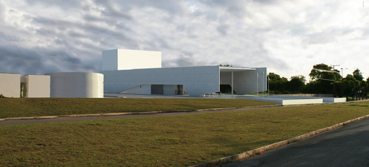 utilização do concreto e do emprego da mão de obra local. O projeto é inteiramente envolvido por uma caixa externa semi aberta, atuando como uma membrana isolante térmica e acústica, proporcionando uma parede dupla. A expressividade do vão de aproximadamente 28 metros é uma característica marcante do projeto, sendo que para que o custo fosse reduzido, foi projetado apoios em quatro pilares que realizam o contraventamento da estrutura como um todo. A leveza é um item essencial na estrutura, sendo que a lâminas externas apóiam-se unicamente sobre quatro pontos: sendo dois no espelho d’água, e os outros dois no urdimento. A lâmina de cobertura do conjunto abriga o sistema de aquecimento solar, e também possibilita iluminação natural no interior da construção (exceto no auditório) através das aberturas zenitais.