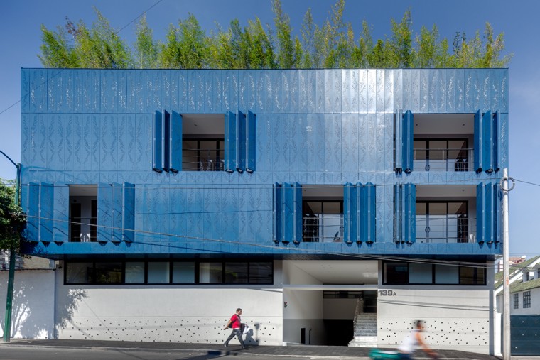 Edificio de Departamentos TK 139 Dentro de un predio de 1,170 m2 se logro identificar un conjunto de variables que permiten que este proyecto de vivienda se valorice con el tiempo. Ubicado en la calle Tecamachalco numero 139, al poniente de la Ciudad de México, entre las Colonias: Lomas de Chapultepec, Tecamachalco y Polanco. Una zona donde se localizan edificios de oficinas, restaurantes, escuelas, áreas verdes y viviendas con un promedio 220 m2. Junto con los desarrolladores se propuso un proyecto de departamentos llamados UNO, ofreciendo un proyecto distinto a lo que se encuentra en la zona principalmente en cuanto al sus dimensiones. UNO es un nombre común que se le asigna a los trajes de astronautas, corredores de autos y motociclistas, es decir: todas la necesidades y sus funciones en UNA sola pieza. El edifico funciona por medio de tres bloques de 21 metros de frente por 11 de nacho. En el cual se desarrollaron 27 departamentos únicos, 20 módulos de 60 m2 y 7 módulos de 120 m2 con tres patios arbolados que provén de iluminación y una máxima superficie de fachada oriente poniente, permitiendo ventilaciones cruzadas y poco uso de iluminación artificial. Todas la funciones se localizan detrás de UN muro lambrin, en el, se ubican todas las instalaciones: eléctricas, hidráulicas, gas, voz y datos, área de guardado, closet, cocina; todo lo necesario en un solo elemento. Este muro- lambrin permite tener la máxima flexibilidad en el interior, libera y extiende las vitas hacia el exterior hasta ser frenadas por le follaje de los arboles ubicado en los patios. Todo el espacio es habitable, los departamentos tiene vista hacia el poniente y al oriente. La fachada principal, sobre la calle de Tecamachalco se opto por una fachada metálica perforada con sistema plegadizo para controlar las vistas generando privacidad y un efecto de diferenciación con un solo elemento. El edificio ofrece servicios similares a los de un hotel, conserje, ama de llaves, un gimnasio, lavandería y tintorería. La azotea es un área verde común donde se desarrollan evento complementarios.