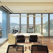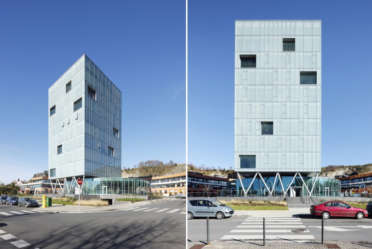 Torre de Oficinas Zaisa, Irún, España La nueva torre de oficinas es el último edificio del centro de transportes Zaisa en Irún. Construida sobre la estructura de un aparcamiento subterráneo ya existente, la torre de ocho plantas se divide en dos volúmenes, uno elíptico, que forma la base, y otro de pisos, que alberga oficinas en alquiler y la dirección del centro de transportes en las dos últimas plantas, comunicadas por un espacio en doble altura. En la última planta se encuentran dos terrazas ajardinadas accesibles desde las salas de reuniones. En planta baja, una estructura en forma de “w” marca los accesos y compatibiliza la estructura inferior del aparcamiento con una estructura óptima para el uso de oficinas en la torre. El edificio se cierra con una fachada doble de vidrio, en el que las diferentes capas permiten lograr un ahorro energético notable a la vez que ofrecer una gran transparencia desde el interior. La fachada se completa con unos huecos de acristalamiento simple que permiten reforzar la sensación de transparencia desde el interior y que constituyen uno de los rasgos que definen al edificio.