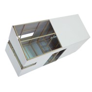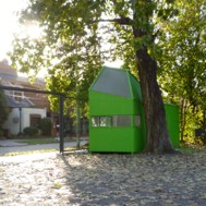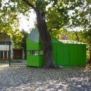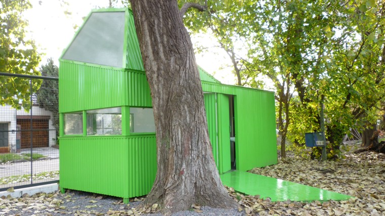 relación con el mundo del artefacto. La verdadera revolución de la tecnología, lo sabemos como consumidores de ciencia ficción, planea en los años venideros utilizar el cuerpo humano como extensión de su plataforma de base. El ojo como cámara, el oído como micrófono, y el corazón como batería o la temperatura corporal. Bajo estos nuevos paradigmas socio-tecnológicos, preámbulo del cyborg de la megalópolis, describir cualquier tipo de arquitectura que se considere a si misma como un artefacto tecno-arquitectónico, por su condición de elemento posado sobre un hecho preexistente , por ser formalmente autónoma al edificio que la alberga, por su materialidad reflectante o por poseer distintos mecanismos de interacción con el medio natural (entiéndase escotillas , tragaluces o bastidores de cierre y apertura manual) no tiene ninguna relevancia, solo divierte ver las fotos , sus colores chillones y como el parásito y el parasitado se fusionan , comprobar su condición de “ovni“ en el medio circundante, ensayar si la teoría se cumple en la práctica y el efecto Venturi funciona tal y como dicen los libros o si el ojo que ilumina frente a la posibilidad de una invasión de sus límites controlados enciende cuando debe … en síntesis, verificar si de una forma o de otra se cumple con la lógica del artefacto . Ficha técnica Obra: Módulo de vigilancia y vestuario Autores: Estudio Borrachia arquitectos - Oscar A. Borrachia -Alejandro H. Borrachia Colaboradores: Edgardo Litovich, Arq. Leonardo Esteves , Maximiliano Mazzitelli , Ariel Asione Ubicación: Hospital de Haedo, Provincia de Buenos Aires Superficie: 15 m2 Año de construcción: 2010
