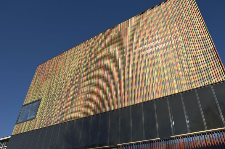 El Edificio GSW y la Comisaria y Estación de Bomberos (ambos en Berlín), el Laboratorio de Investigación Farmacológica (Biberach) o el Centro de Innovación y Desarrollo para Sedus (Dogern) constatan cómo el color es un elemento definitorio de la arquitectura de Sauerbruch Hutton, el equipo fundado en 1989 y con sede en Berlín y autores del nuevo edificio que acoge las más de 700 obras realizadas durante la segunda mitad del siglo XX y algunos de los más importantes artistas actuales de la Colección Udo y Anette Brandhorst. Inaugurado el pasado 21 de mayo, el Museum Brandhorst es un volumen rectangular, alargado y estrecho, que se emplaza en un distrito de Munich tratando de articularse en comunicación con la actividad del vecindario de la zona así como buscando un diálogo con un cercano elegante bloque de viviendas diseñado en los años 50 por el arquitecto Sep Ruf. Su posición toma asimismo como referencia el emplazamiento del edificio de la Pinakothek der Moderne en continuidad con éste, pero también tratando de redefinir y otorgar un nuevo énfasis a la intersección urbana donde el nuevo edificio se sitúa. El exterior del Museum Brandhorst se distingue por su expresión polícroma que, en primera instancia, quiere metaforizar a través de su energía visual el carácter del espíritu de las obras artísticas que el interior alberga. Todo el edificio está cubierto por tiras metálicas, conteniendo cada segmento dos colores diferentes que se alternan horizontalmente, de manera que se crea una paleta de 23 colores que abarcan desde el violeta oscuro al amarillo claro, estableciendo tres franjas cromáticas distintas, en zonas de tonos oscuros, medios y brillantes. Tras esta capa se ha situado otra que envuelve todo el edificio, compuesta por 36.000 baldosas cerámicas y que, en combinación con las tiras metálicas, producen diferentes cualidades de sombra. Desde una perspectiva conceptual, los arquitectos han querido sintetizar y reinterpretar libremente conceptos de Gottfried Semper y Bruno Taut para lograr hacer emerger una edificio de imagen poderosa pero, simultáneamente, sutil que provoca un efecto perceptual complejo, desconcertante y atractivo, a través de las diferentes impresiones que genera en el paseante que camina junto a él o para el individuo que se detiene a contemplarlo deliberadamente desde diferentes ángulos. El interior se yuxtapone a esto al ser un espacio eminentemente blanco y neutro, iluminado por luz natural. Las cualidades lumínicas, disposición y superficie de las galerías difiere en función de cada piso, habiéndose situado en el nivel inferior las salas más pequeñas , adecuadas unas condiciones que permitan la exhibición de piezas tridimensionales . A nivel intermedio se sitúa un patio conteniendo seis salas iluminadas artificialmente y dedicadas a la exposición de fotografía y obras sobre papel, conteniendo asimismo espacios adecuados para obras de video y arte electrónico. En el nivel superior se encuentran las salas de mayor tamaño hasta de 450m2, iluminadas con luz natural tamizada por un tejido que desde el techo matiza su entrada, destinadas a las obras de gran formato, incluyendo un espacio específicamente diseñado para albergar las doce pinturas que integran el Lepanto Cycle de Cy Twombly, artista cuyas obras, junto a las de Andy Warhol, constituyen las piedras angulares de la colección Brandhorst. A diferencia de otros ejercicios coloristas realizados recientemente, e incluso de obras previas en la trayectoria de Sauerbruch Hutton, esta propuesta trasciende el mero intento de generar una fachada multicolor. El color, aunque más correcto es decir en este caso el cromatismo, permite ciertamente imbuir a este edificio de una identidad singular como pieza urbana que es representación de un museo de arte contemporáneo, en contraposición a la cual, la neutralidad del blanco interior es aplicada para generar un perfecto espacio contenedor para el arte. Y pone de manifiesto cómo estos arquitectos han alcanzado una capacidad superior para construir experiencias complejas a través de la experimentación con el color. La disposición aleatoria pero dirigida de los colores en la fachada del Museum Brandhorst (corroborando su afirmación de que no trabajan supeditados a ninguna teoría de los colores) les ha permitido evitar constituir este edificio como un mero cuerpo polícromo, logrando crear una experiencia cromática (a través de una piel donde la policromía crea una especie de efecto cromático que evoca la posibilidad de una compleja monocromía) a través del cual logran ensayan un nuevo modo de mirar y ver un edificio. Esto les permite alejarlo de la naturaleza de edificio-objeto que podría atribuírsele a priori, y proponer un ejemplo que ayude a sostener la especulación de Ludwig Wittgenstein, cuando escribiera que los conceptos de color tienen que tratarse como los de sensación.