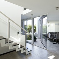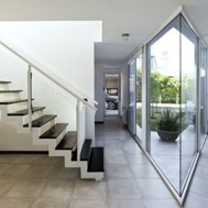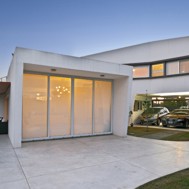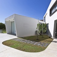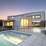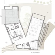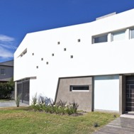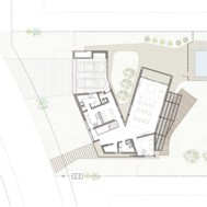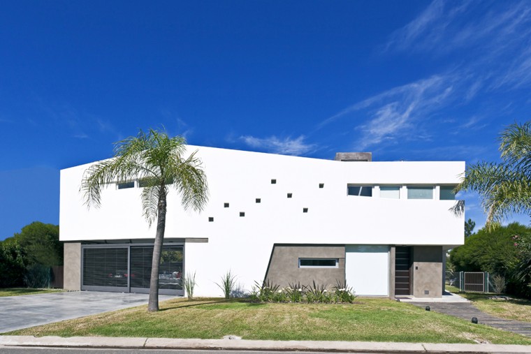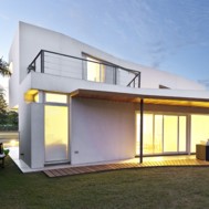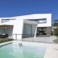 Casa V - Funes Hills Cadaques - Santa Fe - Argentina / I + GC [arquitectura] - Matías Blas Imbern + Agustina González Cid La idea para este proyecto fue armar una casa en torno a un patio sin tener que recurrir al claustro, aprovechando la forma irregular del terreno. Es así como surge la “V”, un volumen que se repliega sobre sí mismo logrando una planta que deja entrar el jardín entre sus brazos. Así se convierte en el corazón del proyecto. Se trata de un volumen fluido que se despega del suelo hacia el frente bajando al girar hasta apoyarse totalmente hacia atrás. La obra da la sensación de movimiento, de una masa compacta que fue estirada hasta alcanzar su forma final, enfatizada con las ventanas longitudinales y con los desniveles en la parte superior de las fachadas. De esta masa fluida se desprende la pileta como extensión de la casa. Esta se relaciona directamente con el espacio semicubierto que sirve tanto para guardar autos como para comer. Así esta expansión y la pileta se encuentran en estrecha relación y funcionan como un único espacio. Todo este conjunto se encuentra rodeado por un piso de formas curvas que se adapta tanto a la casa como a la vegetación del lote. Dinamismo y fluidez son las características que destacan la estrategia de esta obra y su relación con el terreno.