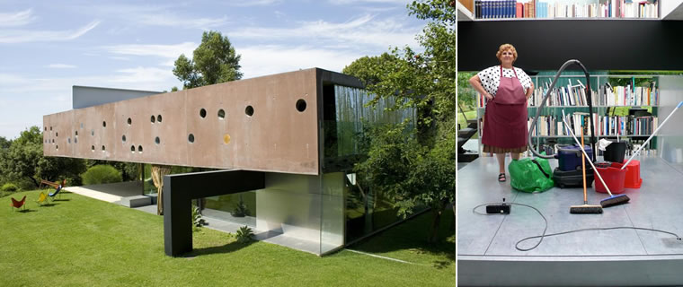 El icono está construido. Los arquitectos-turistas peregrinan para contemplar en vivo la pieza maestra: un símbolo de la tardomodernidad que se encuentra al mismo nivel de obra capital que la Ville Savoye de Le Corbusier, la Casa Schröder-Schräder de Gerrit Rietveld, la Casa de la Cascada de Frank Lloyd Wright o la Casa Farnsworth de Mies Van der Rohe. Una casa que es un manifiesto arquitectónico antes que una vivienda. Con esa presentación de credenciales de la Casa en Burdeos comienza el documental Koolhaas Houselife de Ila Bêka y Louise Lemoîne. Bêka y Lemoîne se proponen la tarea de comprobar cómo funciona esta obra, fundada en una compleja abstracción, y que los teóricos han sacralizado planteando cómo un exponente de nuevas experimentales narrativas del habitar y de los temas fundamentales de la arquitectura koolhaasiana. El de estos realizadores es un ejercicio no exento de sana tendenciosidad para desvelar la parte oculta de este icono construido mediáticamente por Koolhaas. Ir más allá de la seguramente innecesaria descripción del edificio, su estructura y concepto y de una laudatoria exaltación. Ver qué hay tras de esta obra indiscutible que, no es una pieza de museo, sino una vivienda actualmente ocupada y en uso. Este ejercicio es llevado a cabo acompañando y filmando, a la manera de un reality, la actividad cotidiana en el interior de la casa de Guadalupe Acedo, la cuidadora y ama de llaves. Éste es el punto a partir del cual llama la atención este documental, que al elegir penetrar en la casa a través de Guadalupe, evitando incluso realizar un retrato de la vida cotidiana de los propietarios y comitentes de la casa, opta por imbuir al filme de un realismo visual y narrativo que opone el retrato de la casa a cualquier posibilidad de mistificación. Sólo aparecerá, veladamente, en la secuencia final la propietaria, no mostrándose en ningún momento la relación e interacción de ella o su esposo, cuya discapacidad motriz fue fundamental en la planificación, con la casa. Seguir y observar a Guadalupe mientras recorre las diferentes estancias y secciones de la casa, limpiando, haciendo las camas, aspirando el polvo, ordenando los libros de los estantes (con riesgo de que alguno que sobresalga del borde de la repisa atasque el movimiento del ascensor en su trayectoria), explicando el funcionamiento del sistema de apertura de la puerta principal sin llaves sino con un joystick, como recorrer los niveles de las rampas del exterior sin fatigarse…resulta interesantísimo: su opinión, exenta de mitificaciones e intelectualismos, y su minucioso conocimiento de cada recoveco de la casa nos guían desvelando, sin artificios, la casa en su realidad más elemental. A las tareas cotidianas de limpieza desempeñadas por Guadalupe se añaden la exigencia de un mantenimiento adicional costoso. Asistimos al ritual de la limpieza de las grandes superficies de cristal y testimoniamos un catastrófico episodio de las goteras que se han apoderado de la pieza maestra. 'Esta casa, dice Guadalupe, no se termina nunca: cuando has terminado de resolver algo en un lado de la casa, tienes que comenzar a resolver algo en el otro'. Sin llegar apenas a los diez años de vida, la casa, constata el documental, tiene graves defectos de construcción y la complejidad de su diseño la hace prácticamente inviable e insostenible. El detalle de una secuencia de 'Mon Oncle' de Jacques Tati visualizándose en el televisor doméstico es un guiño a través del cual confesar su mirada subliminal, aunque su intención no es la sátira sobre la Casa en Bordeaux – y con ello de los conceptos e investigaciones de la arquitectura contemporánea- sino contraponer los niveles mentales con los que el arquitecto plantea la realidad que se construirá a través de su obra (una dimensión unidireccional) y una de las variantes que constituyen la multiplicidad de realidades que constituirán la realidad efectiva de la obra construida. Pero si el documental es aleccionador y proporciona una perspectiva interesante mostrando lo complejo que puede resultar habitar dentro de una entelequia, seguramente la parte más importante para comprender muchas cuestiones arquitectónicas no se encuentra dentro del mismo documental sino en la entrevista con Rem Koolhaas que figura como ‘extra’ en el DVD donde, en una muestra de saber utilizar inteligentemente su medio como herramienta para la reflexión, los realizadores nos muestran al arquitecto frente a las imágenes del documental y la experiencia de Guadalupe. Esta breve entrevista es absolutamente elocuente al mostrar al gran ideólogo omnipotente luchando para evitar ser filmado desmoronándose ante el pragmatismo de una asistenta. Resulta elocuente ver su gesticulación y el desdén hacia la mujer. La primera pregunta que, incómodo, se le ocurre formular es si fue deliberado elegir un día lluvioso para la filmación. Sin ser consciente que otros arquitectos de la misma categoría de la que él se jacta tampoco hubieran superado con éxito ese test de Guadalupe sobre la adecuada funcionalidad de la vivienda. Divaga con artificios para tratar de defenderse y protegerse al ser desenmascarado sin argucias: ante la imagen objetiva y sus esfuerzos de protección tras la pedantería intelectual alcanzan absolutos niveles de hilaridad cuando trata de sublimar su proyecto y defenderse ante los graves defectos de construcción que hacen de la casa el permanente nido de inconvenientes que plantea Guadalupe afirmando que el filme expone la 'colisión de dos sistemas: una especie de concepción platónica sobre la limpieza y una concepción platónica sobre la arquitectura'. Paradójicamente, el documental logra lo que no hubieran logrado farragosas y sesudas tesis: la posibilidad de desnudar al gran gurú de la cultura mediática arquitectónica ante la imagen de la realidad de su propia obra, aterrado ante la posibilidad de que la evidencia sobre su cuestionab